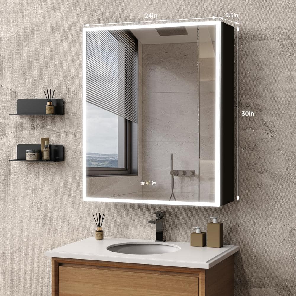 tunuo 24 in. W x 30 in. H Rectangular Black LED Light Anti-fog Aluminum Surface Mount Medicine Cabinet with Mirror