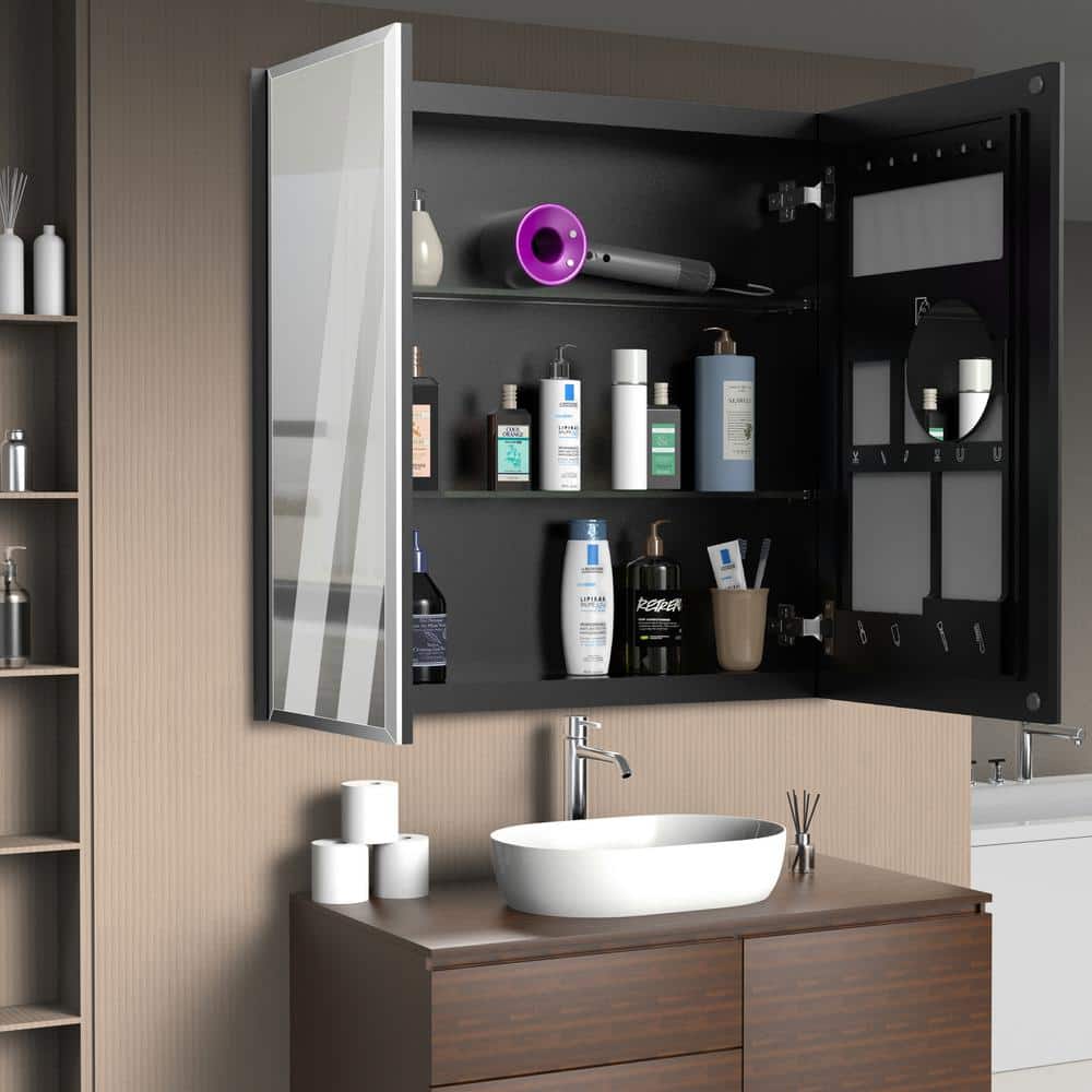 The Tunuo 30 in. x 26 in. Rectangular Recessed Aluminum Medicine Cabinet with Mirror combines elegance with functionality. Featuring a durable aluminum construction, it includes adjustable glass shelves for custom storage, a concealed 3x magnifying mirror, and a sleek black finish that complements any bathroom décor.