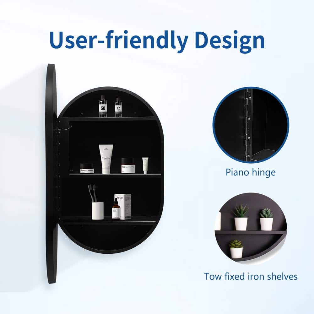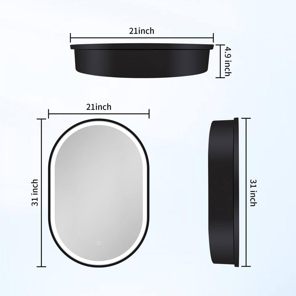 Upgrade your bathroom with UPIKER's 21-inch Oval LED Medicine Cabinet with Mirror. This sleek and contemporary cabinet boasts a stylish black aluminum frame, offering multi-layer storage and energy-efficient LED lighting with three adjustable color temperatures. Experience enhanced functionality with adjustable shelves, anti-fog technology, and easy maintenance, making it a perfect blend of elegance and practicality.