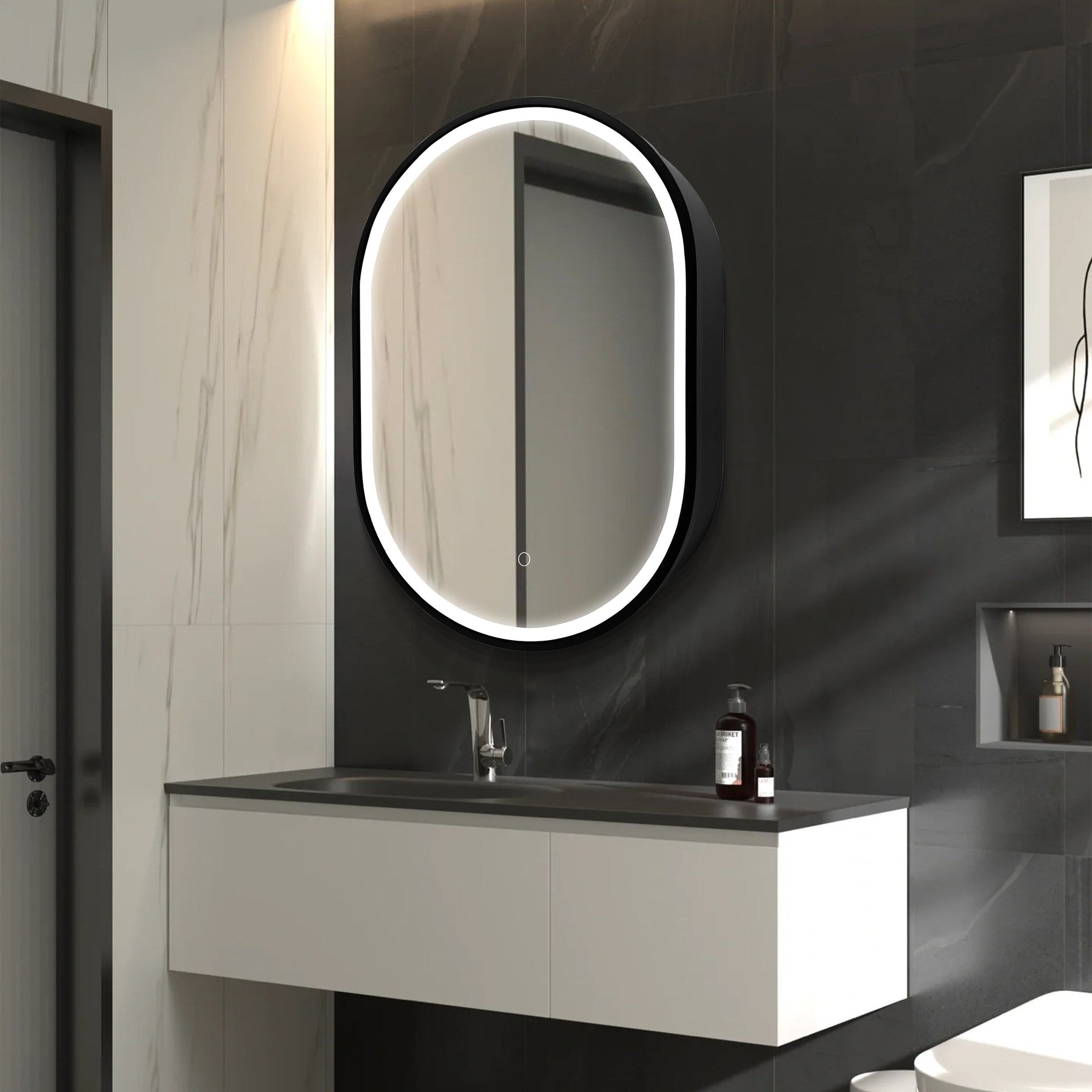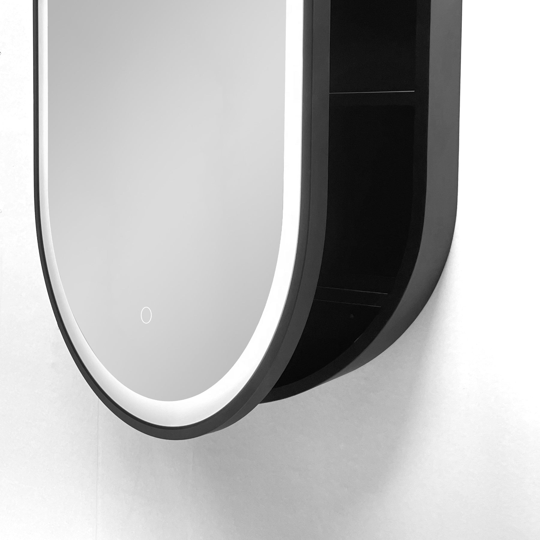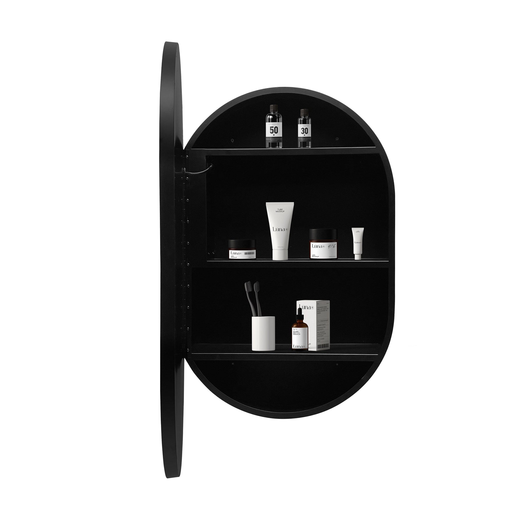 The WELLFOR AO Lighted LED Medicine Cabinet combines elegance and functionality. This sleek, black steel oval cabinet features fog-free technology and adjustable LED lighting, creating the perfect bathroom centerpiece. Enhance your space with its soft-close mechanism and ample storage for a clutter-free environment.