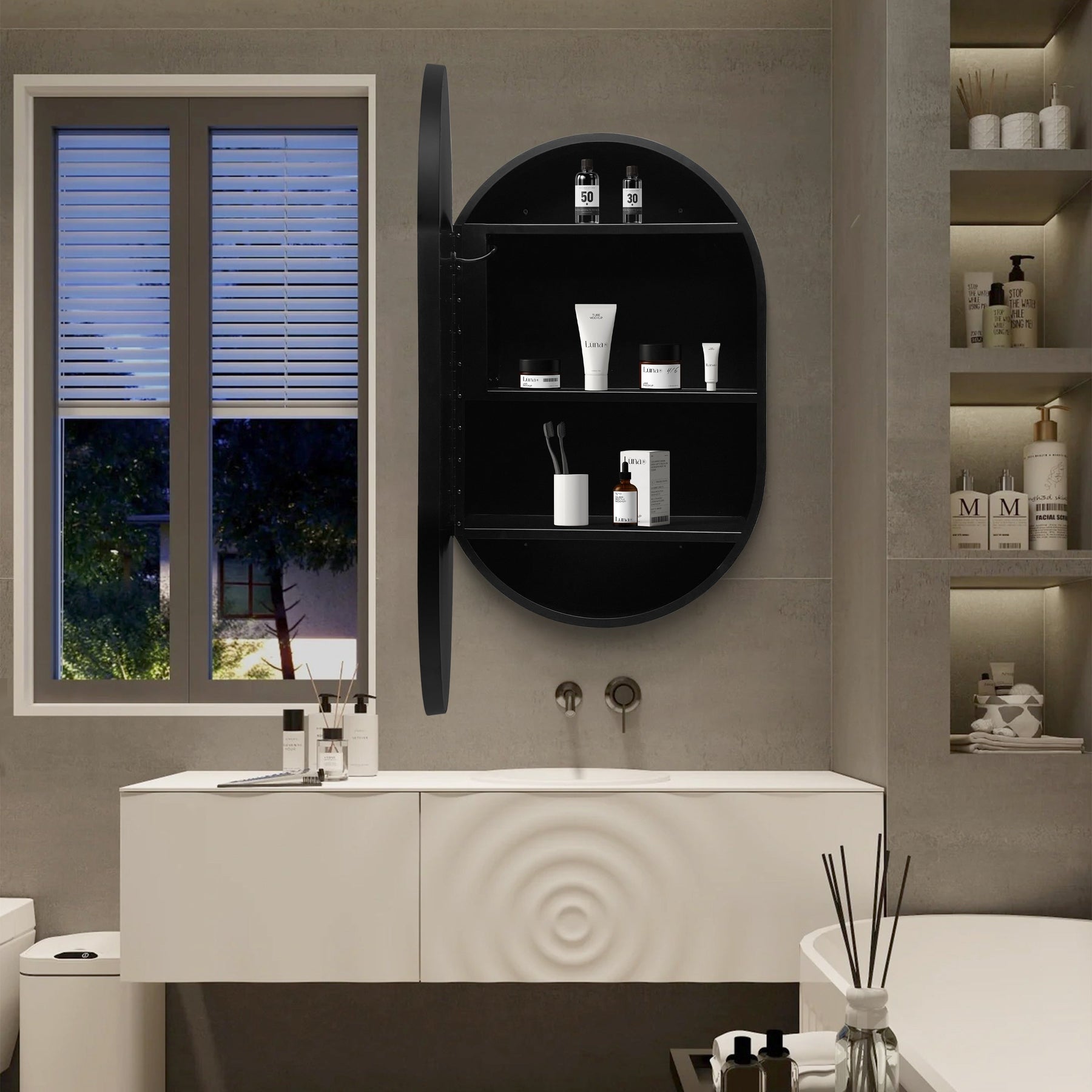 Transform your bathroom with this stunning medicine cabinet designed to captivate. The elegant soft-close mechanism and fog-free technology ensure this piece is both functional and exquisitely engineered. Envision it as a central point in a minimalist bathroom, where its black iron finish provides a sophisticated allure. Highlight its oval mirror by pairing it with contemporary fixtures for a setting that exudes opulence and effortless style. Essential for those who adore luxury and refined living.