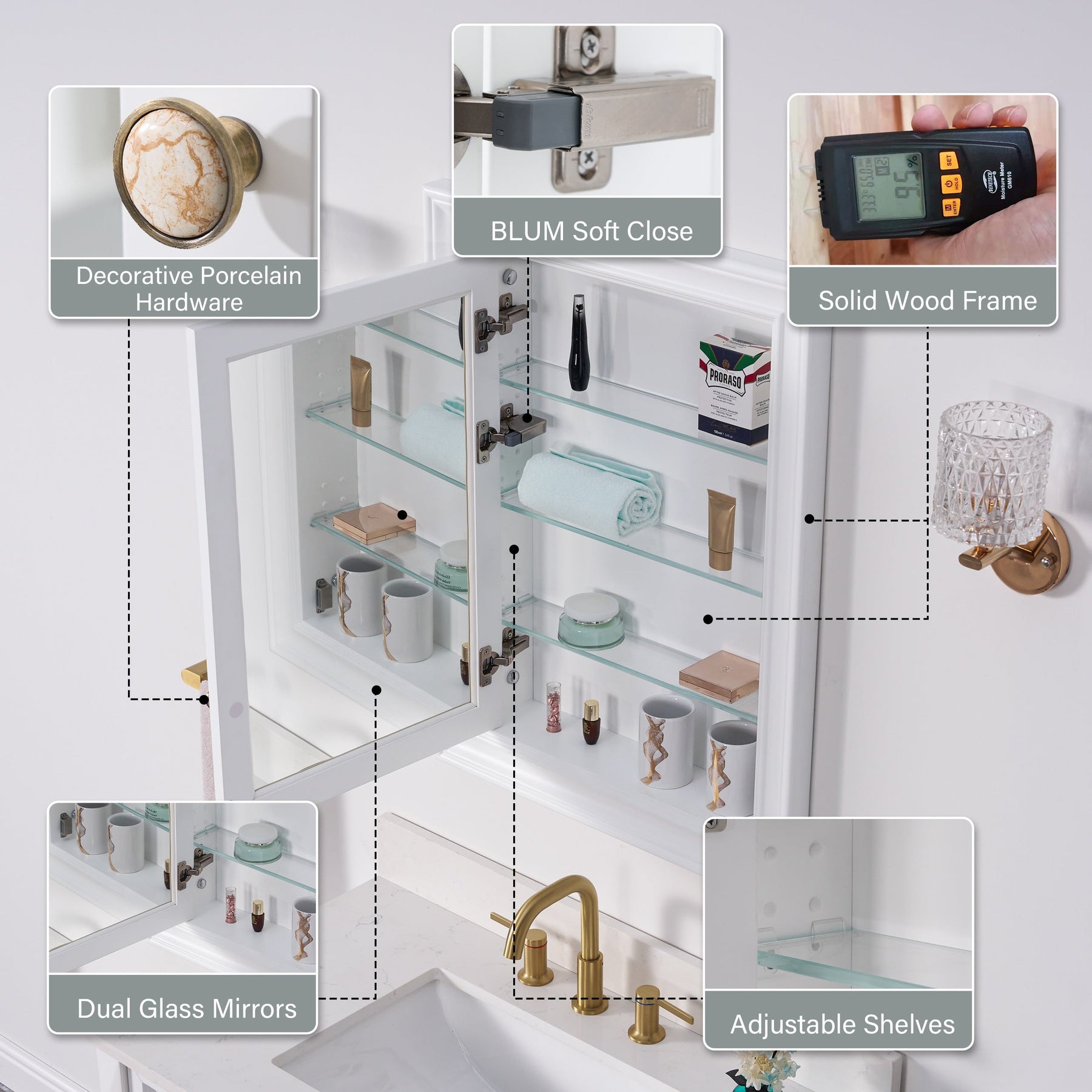 A: Yes, the cabinet incorporates Austria BLUM soft-close hinges which provide a smooth and quiet door closure, reducing noise and wear over time.