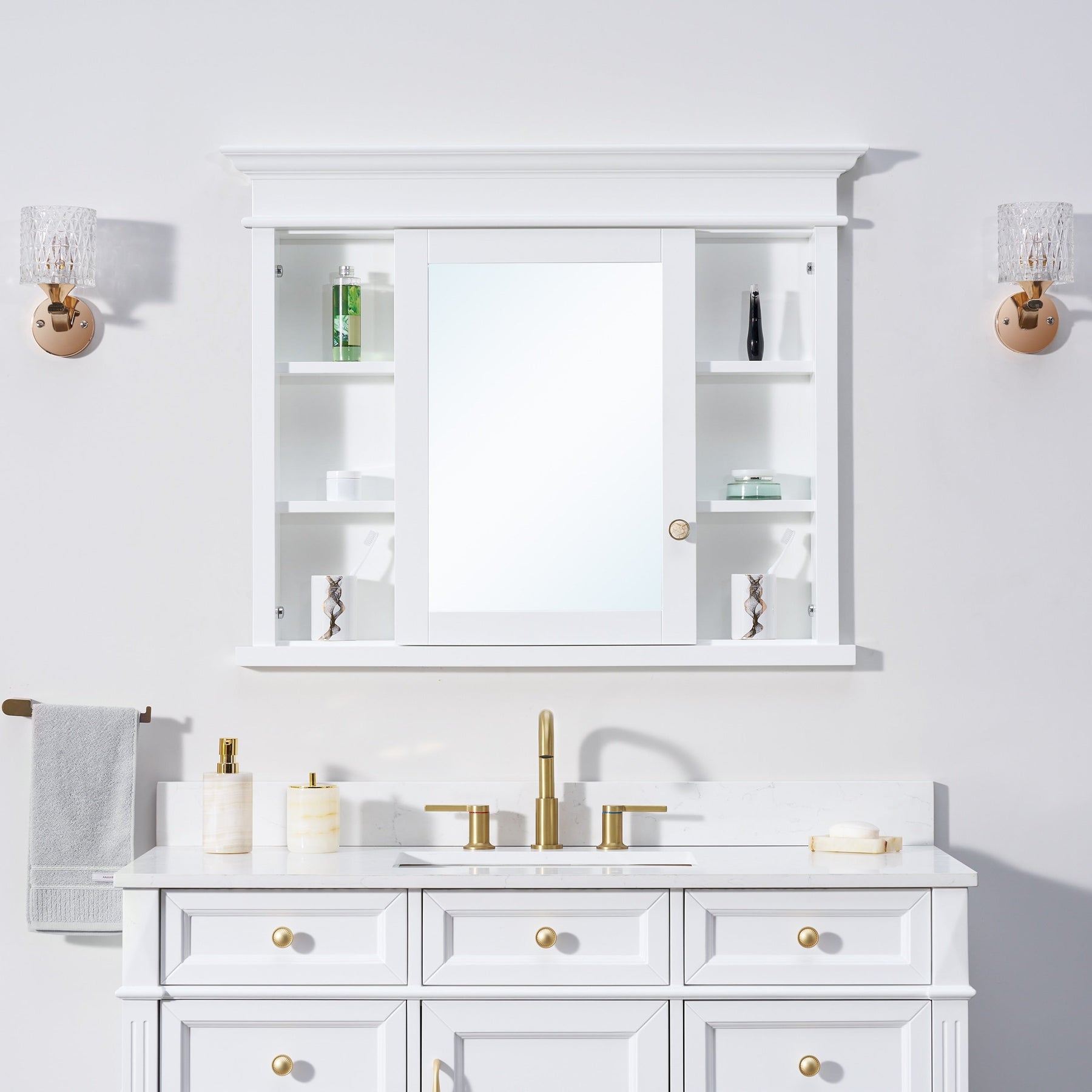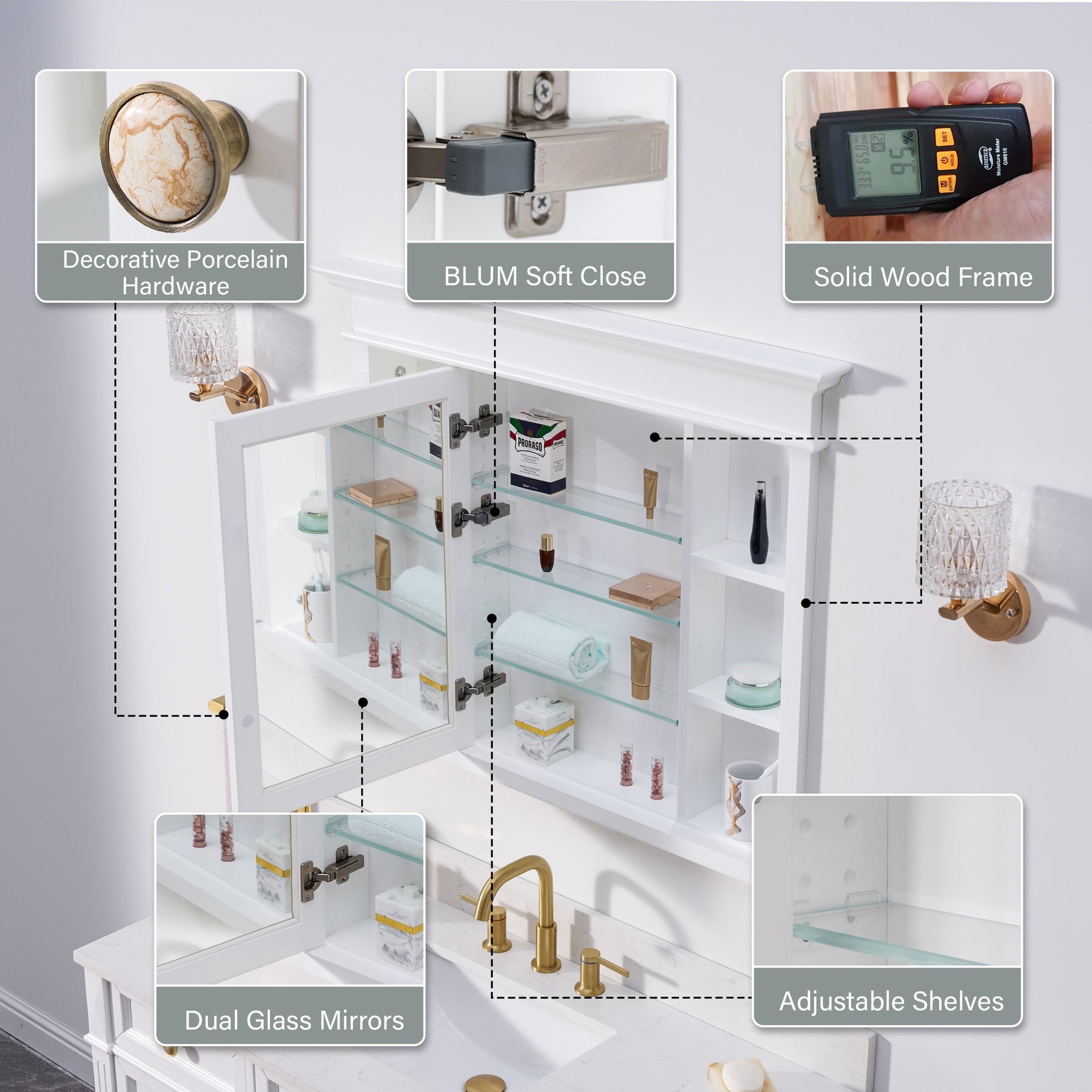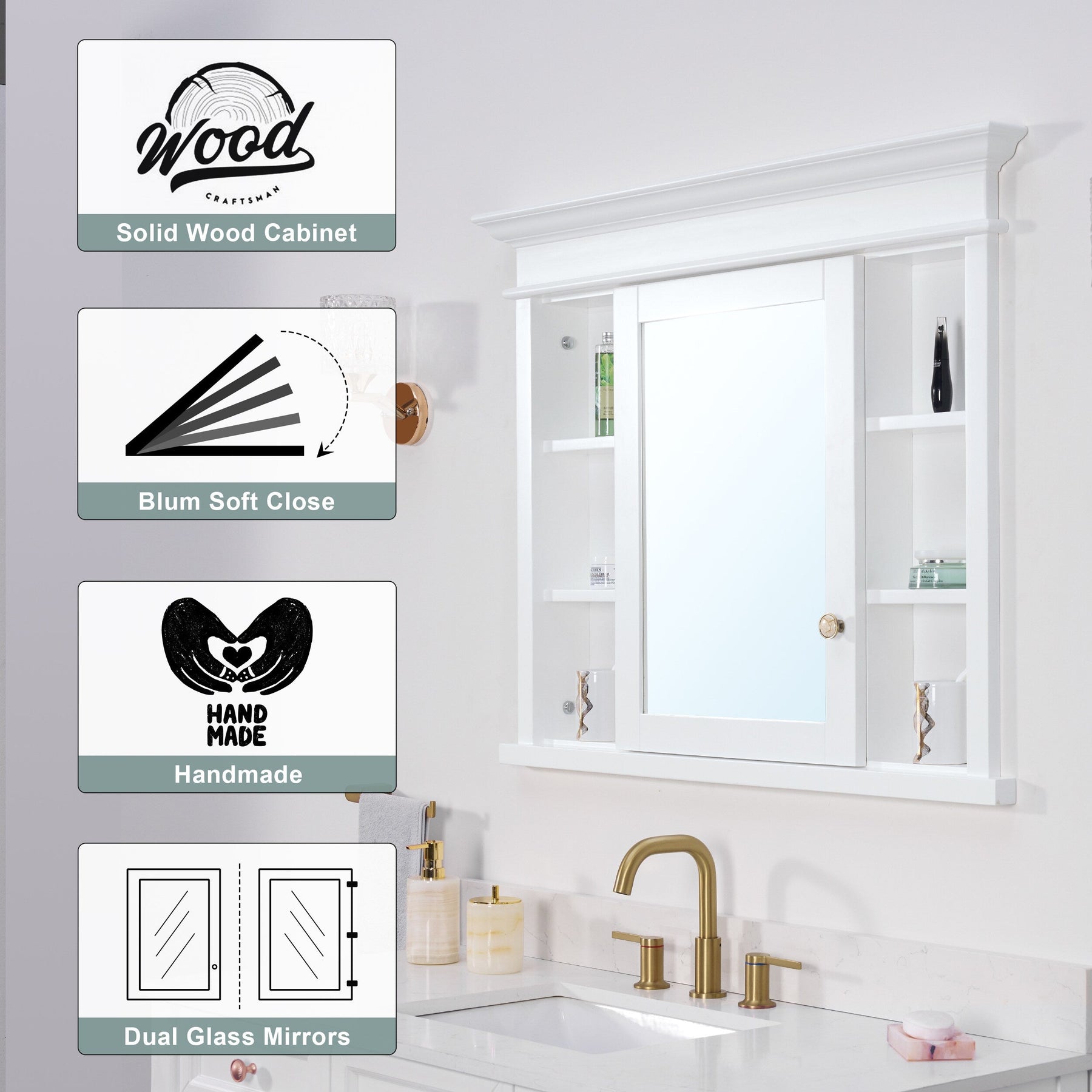 Elevate your bathroom aesthetic with the WELLFOR GRACE Solid Wood Medicine Cabinet. Featuring a minimalistic white finish and quality craftsmanship, this cabinet offers both luxurious design and practical functionality with its soft close hinges and versatile storage options.