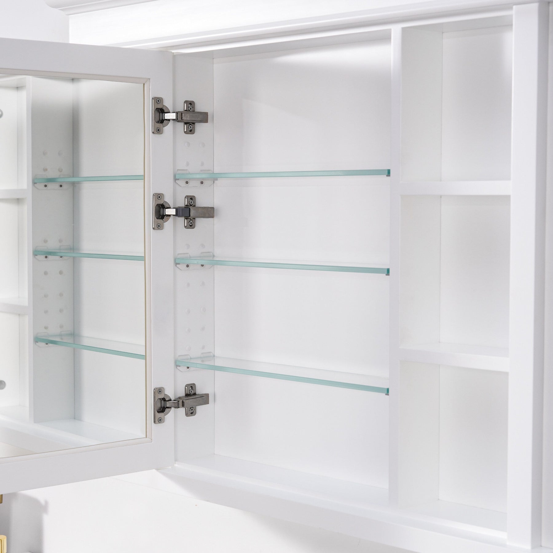 A: The cabinet features a single mirrored door that swings left and utilizes a soft-close mechanism for quieter operation.