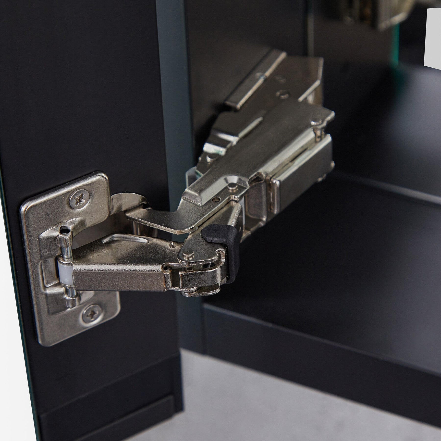 A: The cabinet is fitted with Austria Blum soft close hinges that ensure the door closes quietly and smoothly, preventing any slamming.