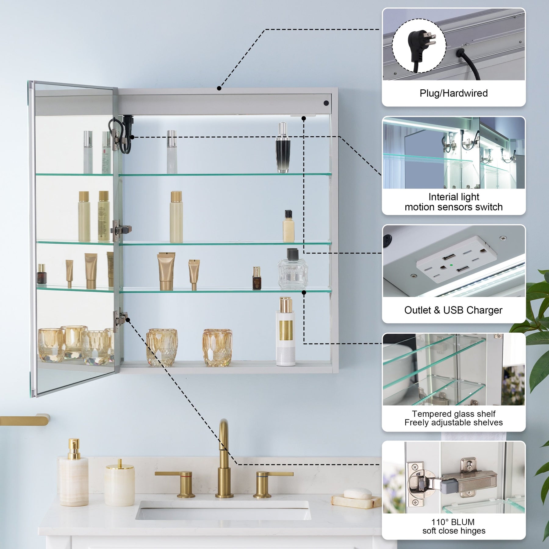 • Soft-Close Hinges: Austria BLUM hinges provide smooth, noiseless operation with 110-degree door opening.