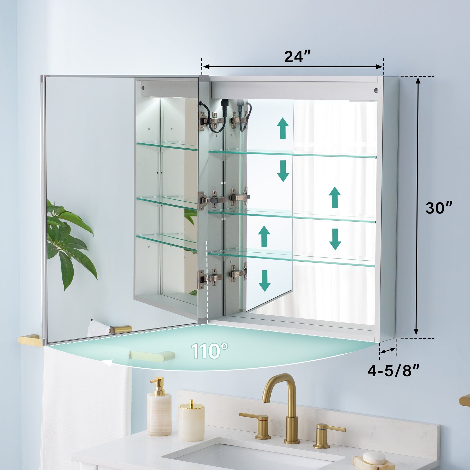 The NIKA 24" x 30" Lighted LED Medicine Cabinet combines cutting-edge technology with sophisticated design, offering a modern solution for your bathroom storage needs. Featuring fog-free mirrors, adjustable lighting, and soft-close mechanisms, this cabinet ensures a seamless blend of style and function.