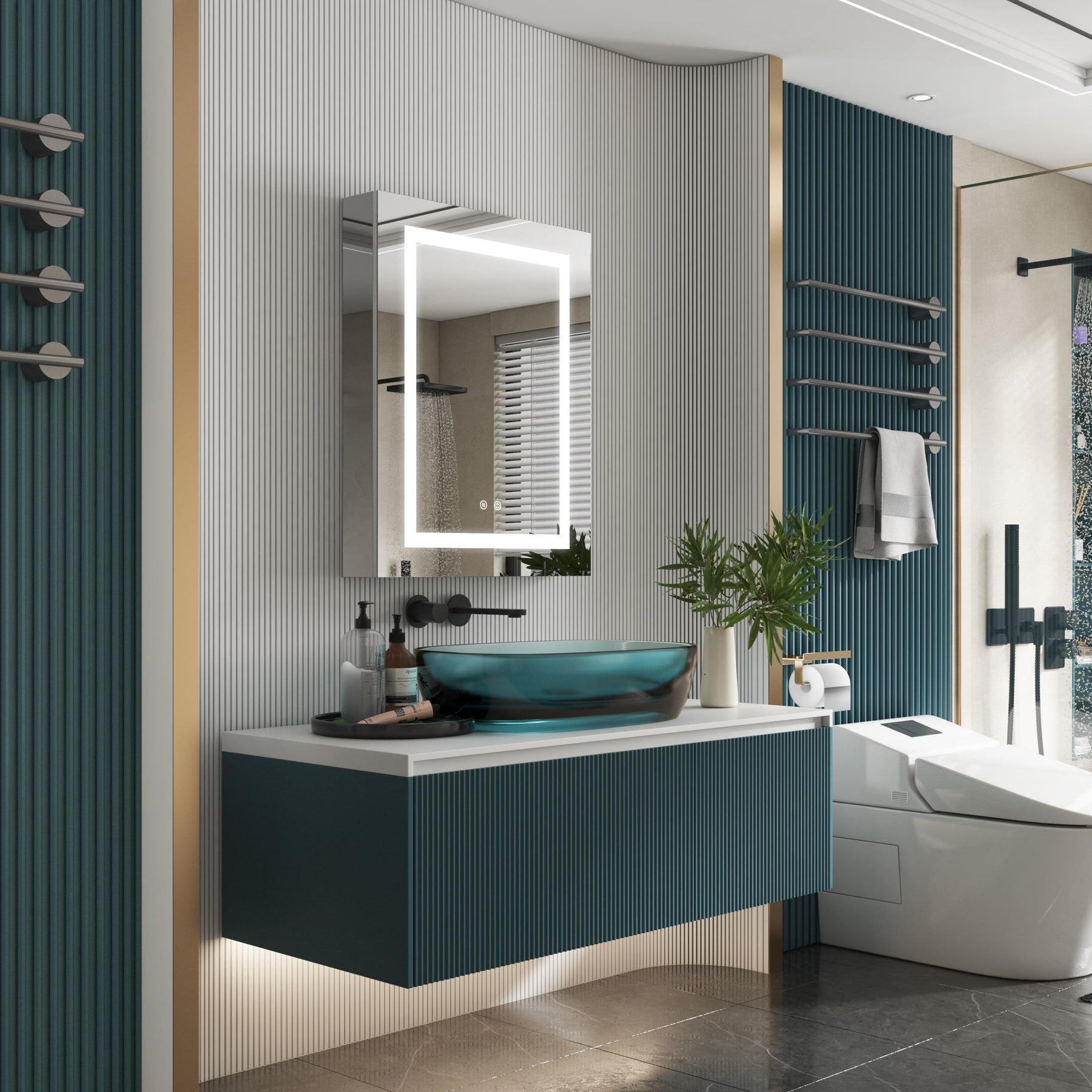 • Lighting: Continuous dimmable LEDs from 2700K-6500K create ideal lighting for grooming and ambiance.
