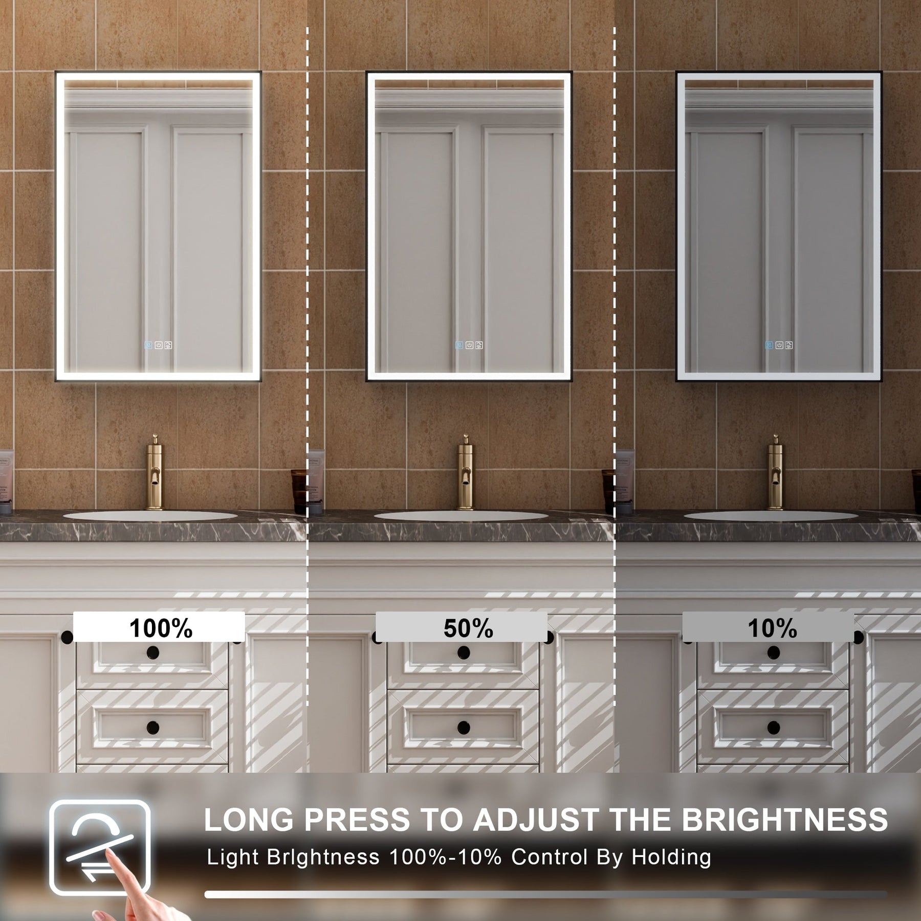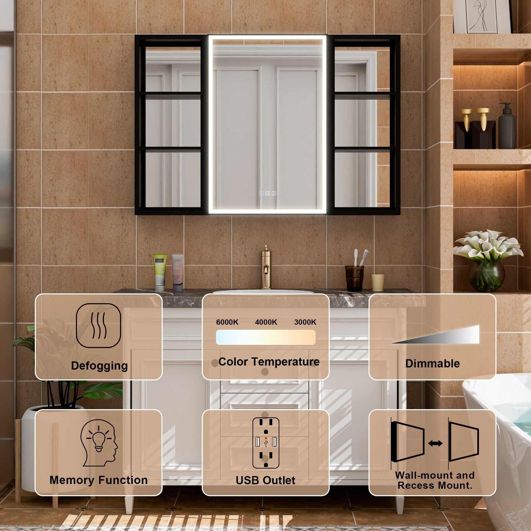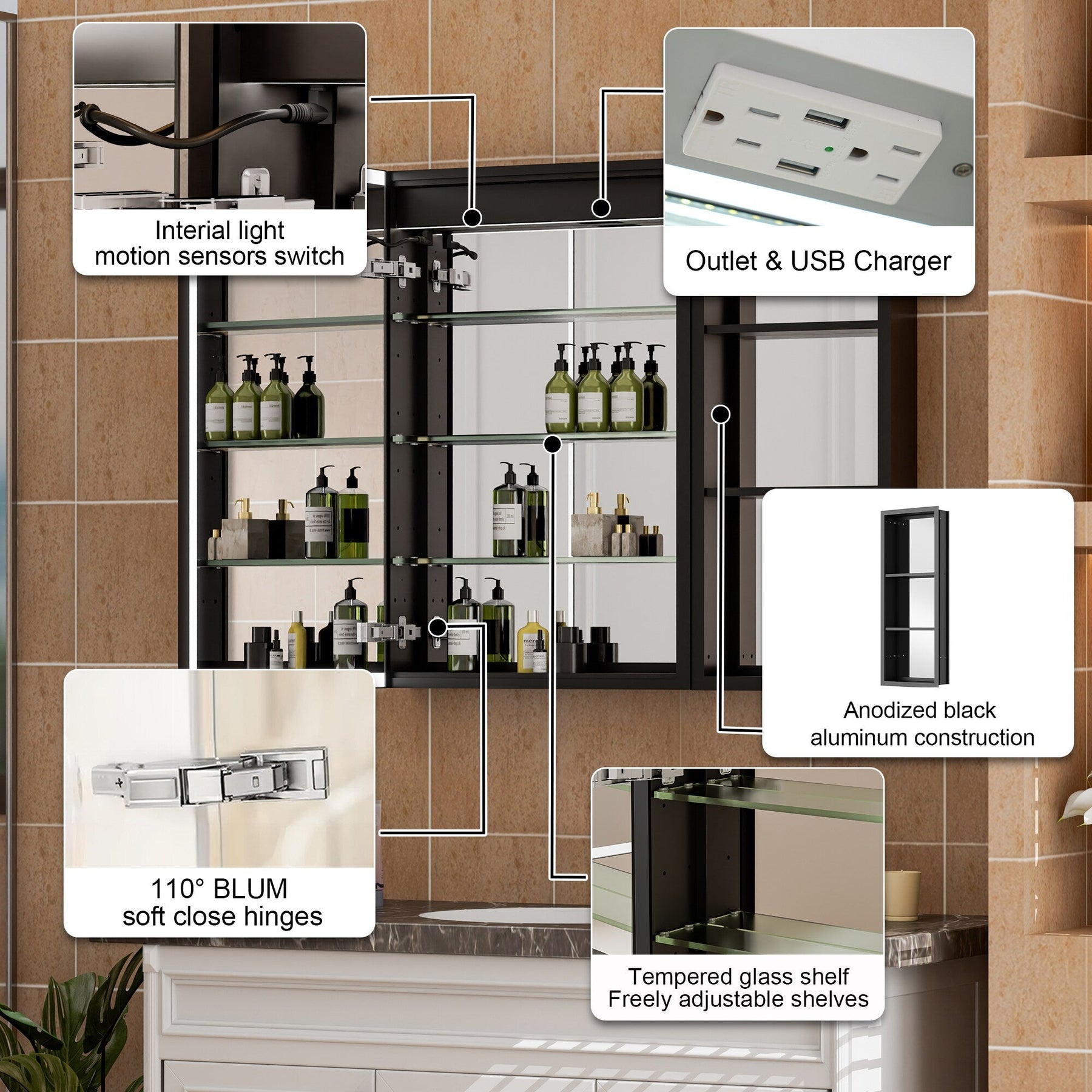 WELLFOR W12 44-in x 30-in Lighted LED Fog Free Surface/Recessed Mount Anodized Black Aluminum Mirrored Soft Close Medicine Cabinet with Outlet