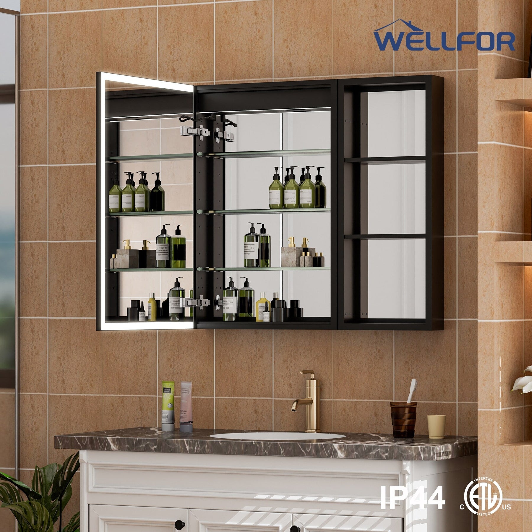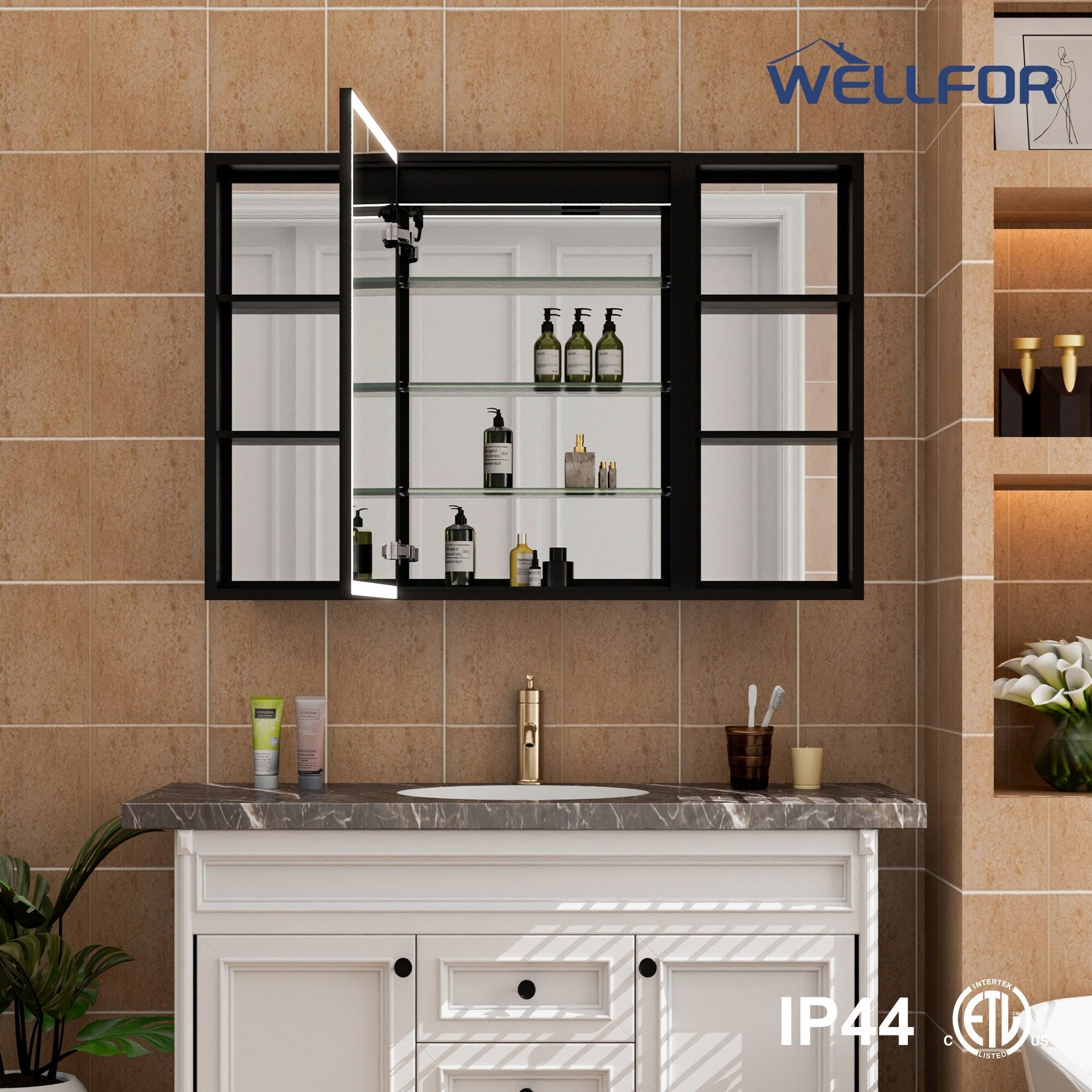 Enhance your bathroom elegance with the WELLFOR W12 Lighted LED Fog-Free Medicine Cabinet. This sleek anodized black aluminum cabinet features dimmable LED lighting, anti-fog technology, and convenient outlets, combining luxury with practicality. Ideal for surface or recessed installation, this cabinet ensures a clutter-free space with its built-in soft-close mechanisms and adjustable glass shelves.