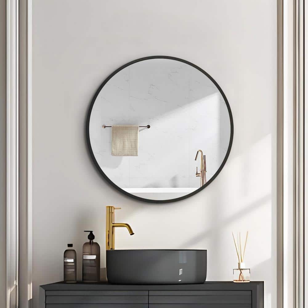 Elevate your bathroom decor with the MEDUNJESS 24 in. Round Black Framed Medicine Cabinet. Its sleek, single-door design and high-quality aluminum construction offer both style and durability. With a mirrored front, this cabinet effortlessly combines functionality and a modern aesthetic.