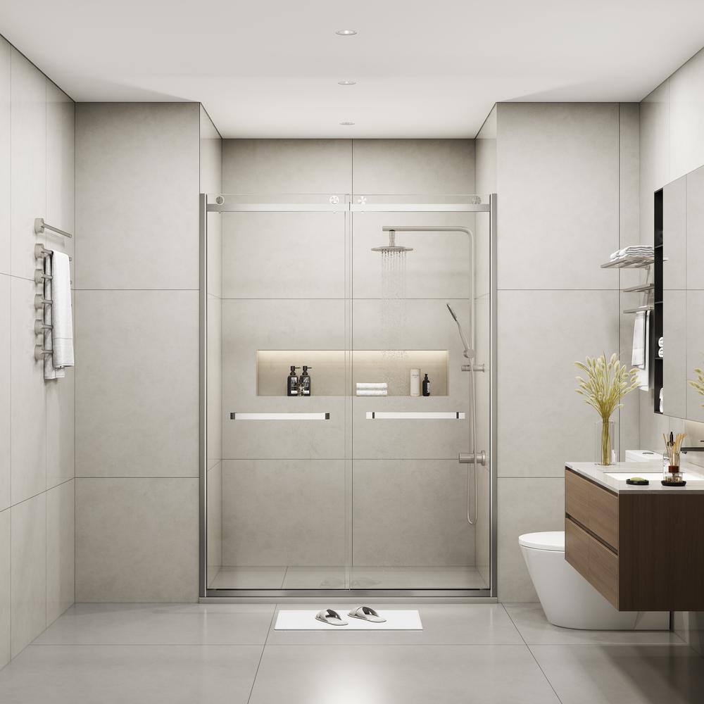 Elevate your bathroom with the MEDUNJESS BradF sliding semi-frameless shower door, designed in brushed nickel with 3/8 in. (10mm) tempered clear glass. This chic, durable door enhances any space with its modern design and smooth sliding operation.