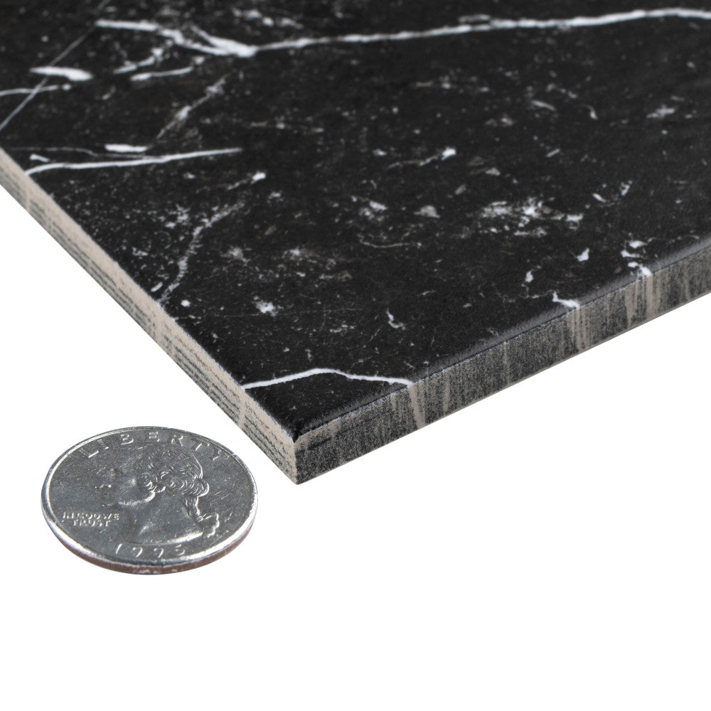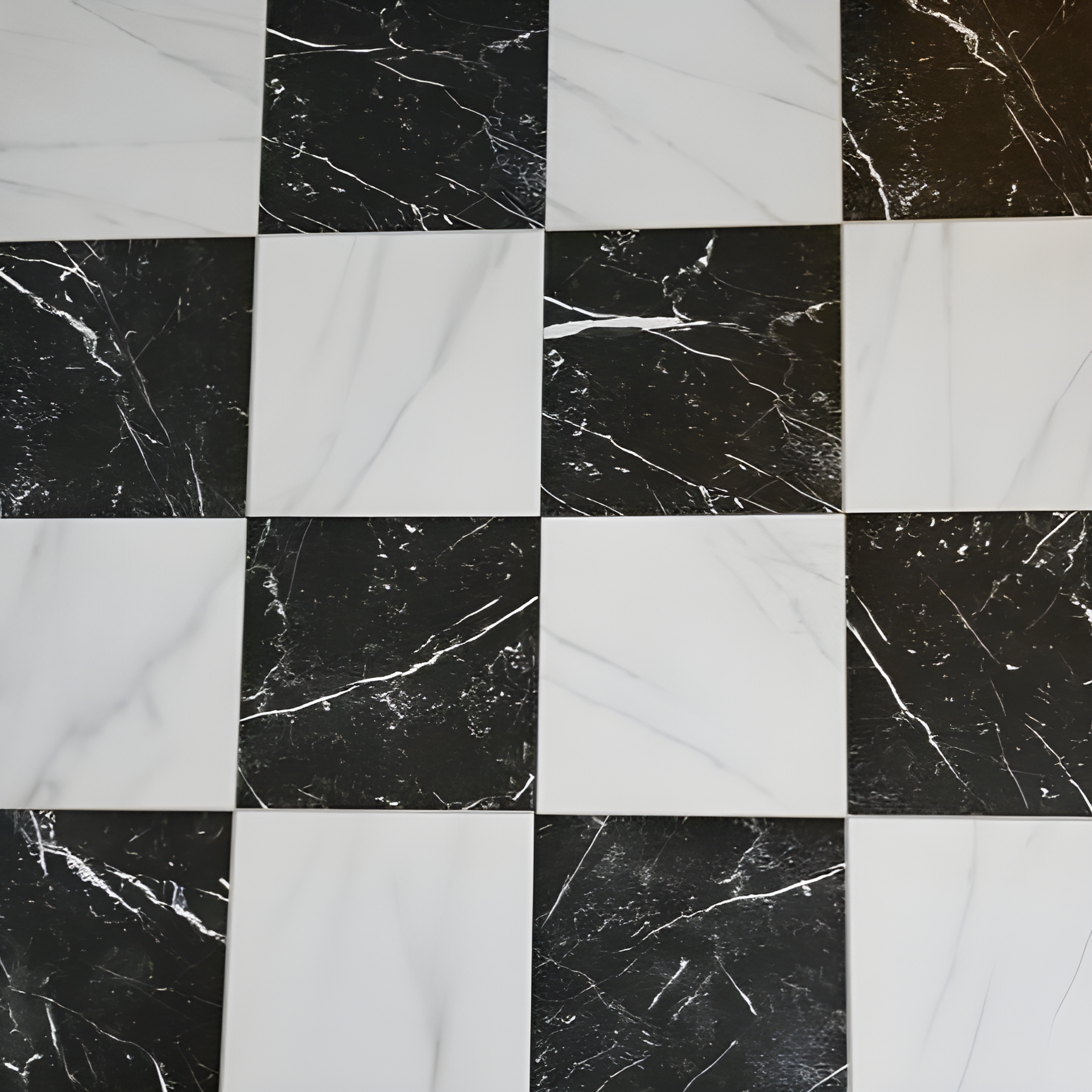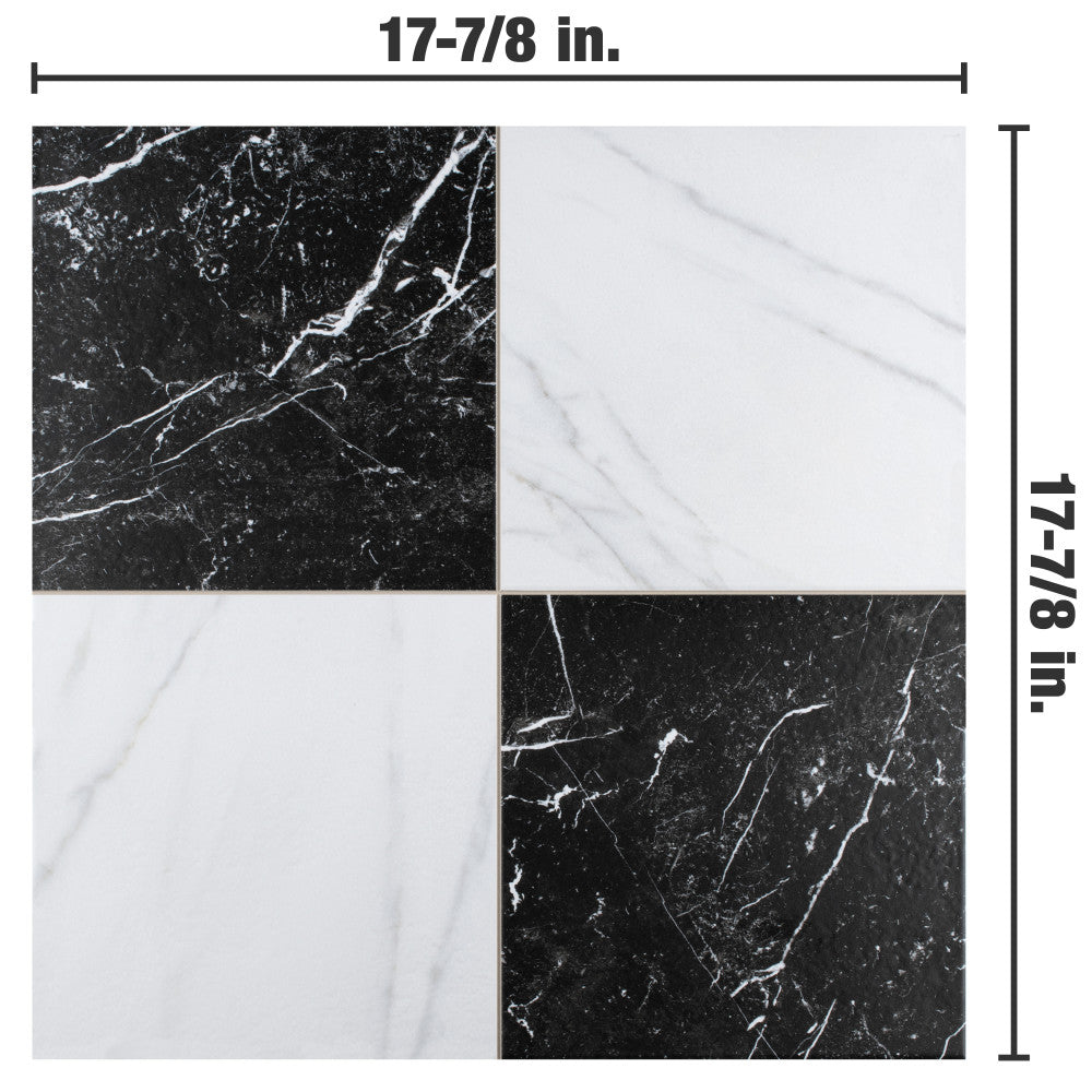 • Timeless Checker Design: Carrara and Marquina-inspired prints with scored grout lines for a classic look