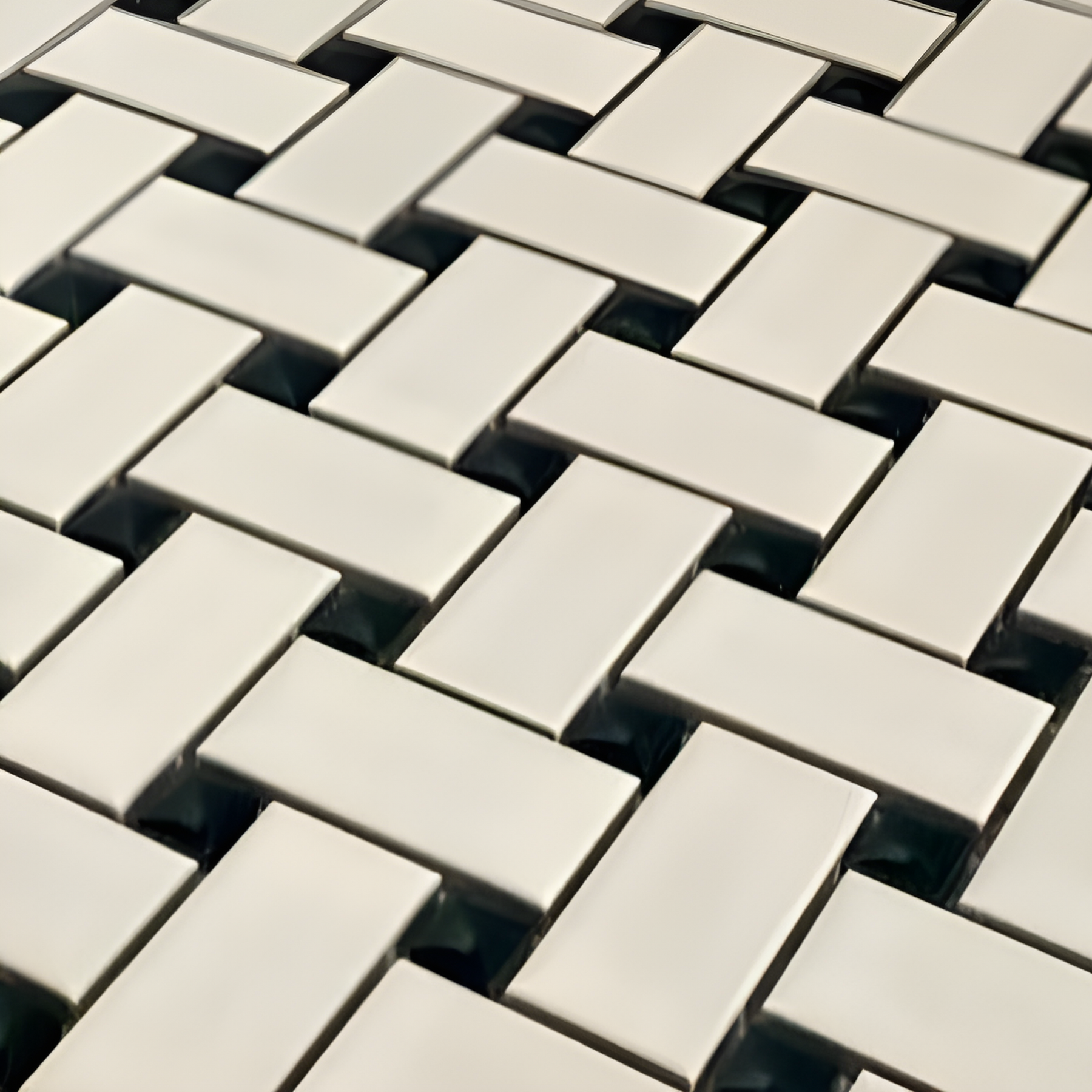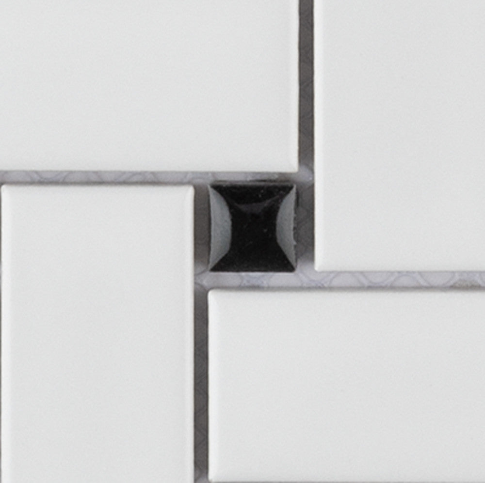 • Basketweave Design: Timeless white field tiles with glossy black dot accents for a vintage-chic look