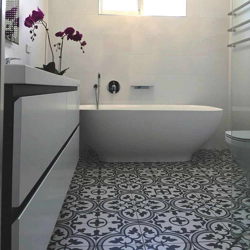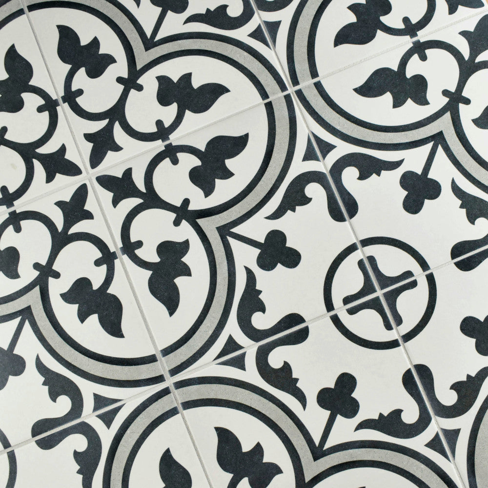 • Encaustic Style Design: Timeless grey-and-white pattern elevates floors, walls, and backsplashes