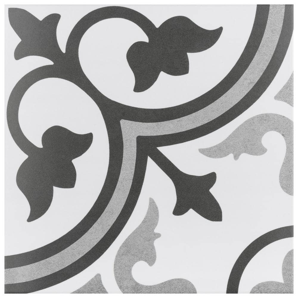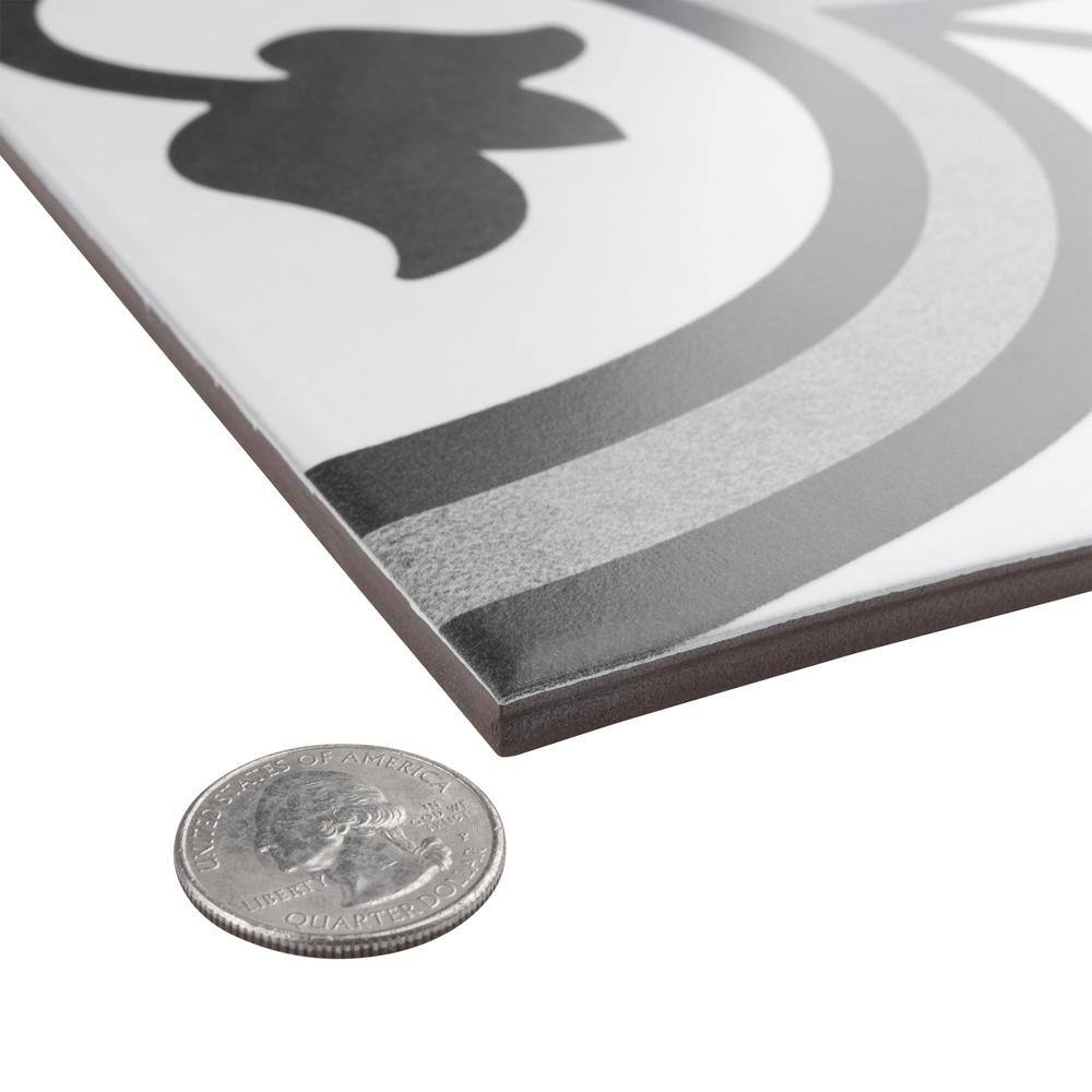 Artisan-inspired ceramic tile featuring a classic black, gray and white encaustic pattern for floors, walls, backsplashes and showers. Durable, water-resistant, and rated for indoor residential use, it brings old-world charm to kitchens, baths and entryways. Matte finish and straight edges deliver a clean, patterned look in any space.