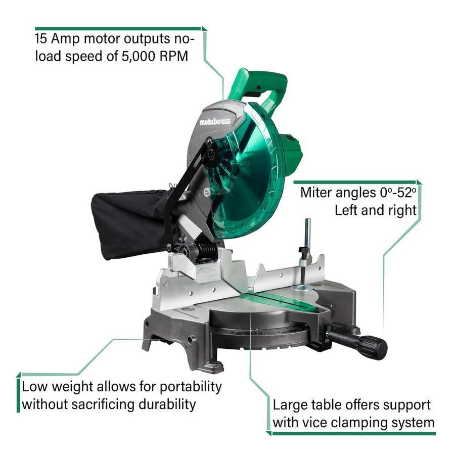 MOTOR: 15 Amp motor delivers high power for the toughest of cuts generating a no-load speed of up to 5,000 RPM LIGHTWEIGHT: Only 24.2 lbs. to facilitate maneuverability and portability MITER ANGLE RANGE: 0-52 degrees, to the right and left for increased flexibility BEVEL RANGE: 0-45 degrees, to the left with adjustable bevel stops for precision cuts LARGE TABLE: Offers better material support with vice clamping system to secure work piece THUMB ACTUATED POSITIVE STOPS: For quick miter adjustments HORIZONTAL HANDLE: For a secure hold