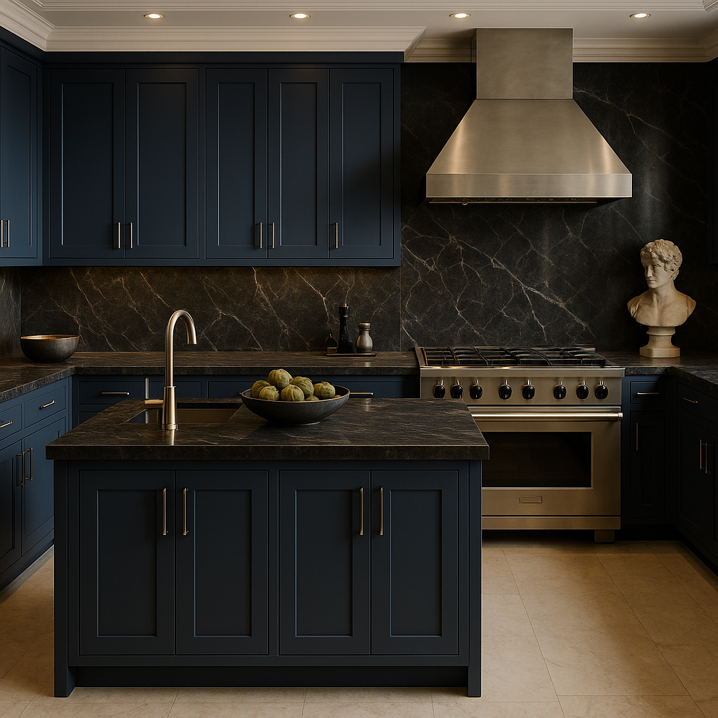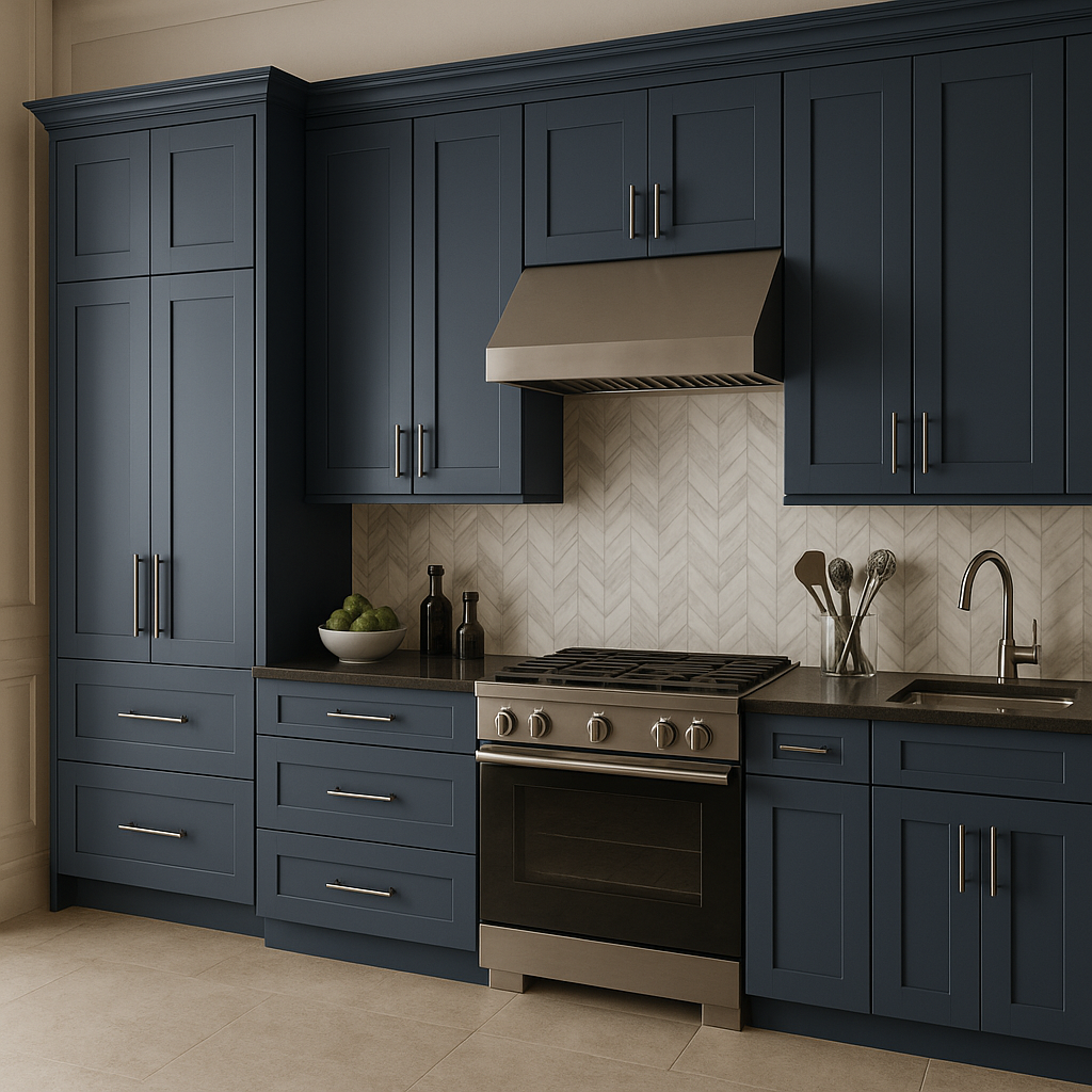 • Elegant Design: Deep blue thermofoil finish with contrasting white back panel.