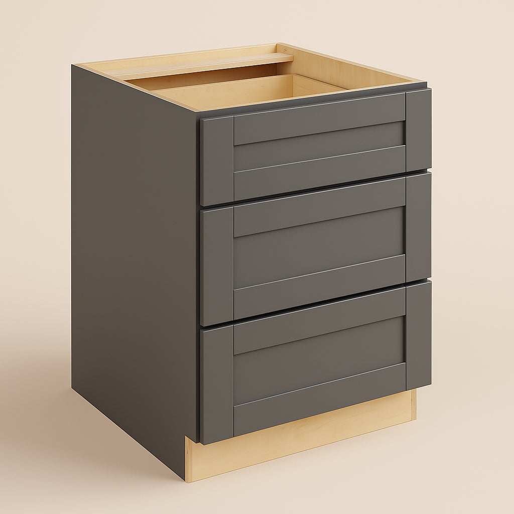 The Richmond Venetian Onyx Shaker Drawer Base Cabinet by MILL'S PRIDE combines elegant design with durable construction. Featuring a dark gray thermofoil finish and plywood material, this cabinet is perfect for modern kitchens. Its soft-close drawers and modular design ensure functionality and style.