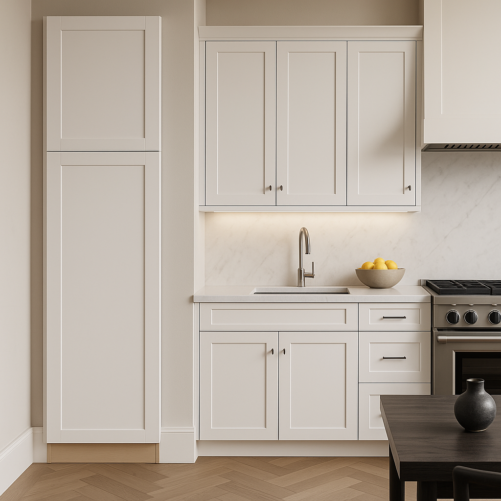 The MILL'S PRIDE Richmond Verona White Shaker Pantry Cabinet combines durable plywood construction with a stylish shaker design. Featuring soft-close doors and adjustable shelves, this cabinet is perfect for organizing your kitchen while adding a touch of elegance.