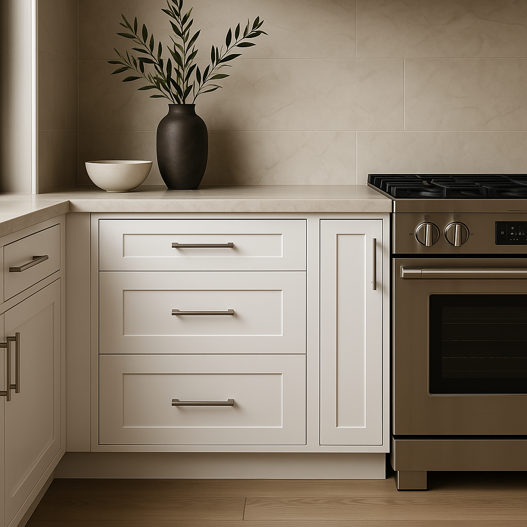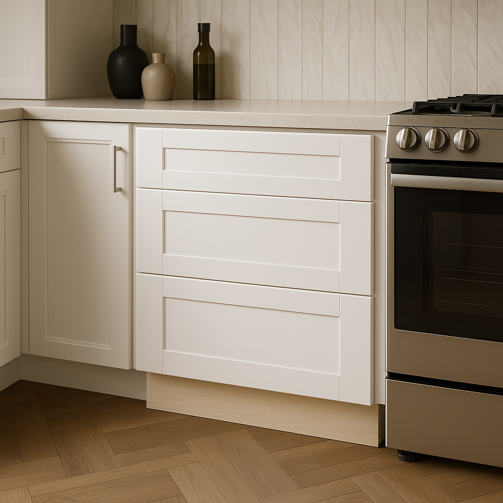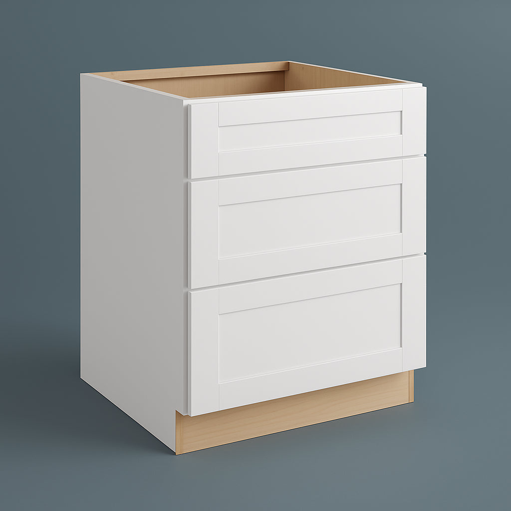 The Richmond Verona White Shaker Drawer Base Cabinet by MILL'S PRIDE combines durable plywood construction with a stylish shaker design. Featuring soft-close drawers and a thermofoil finish, this cabinet is perfect for modern kitchens.