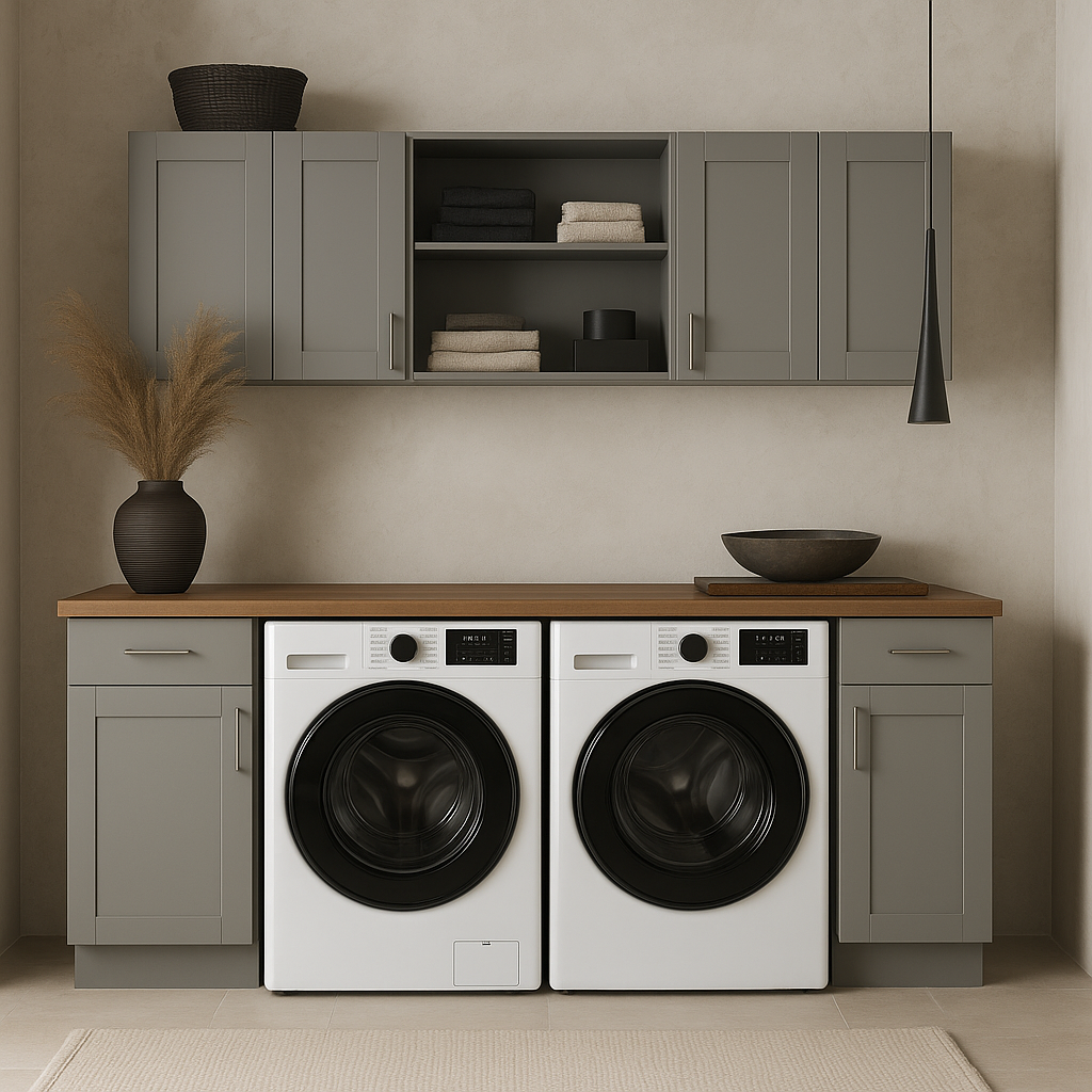 Upgrade your laundry room with the stylish and durable Richmond Vesuvius Gray Kitchen Cabinet Set today!