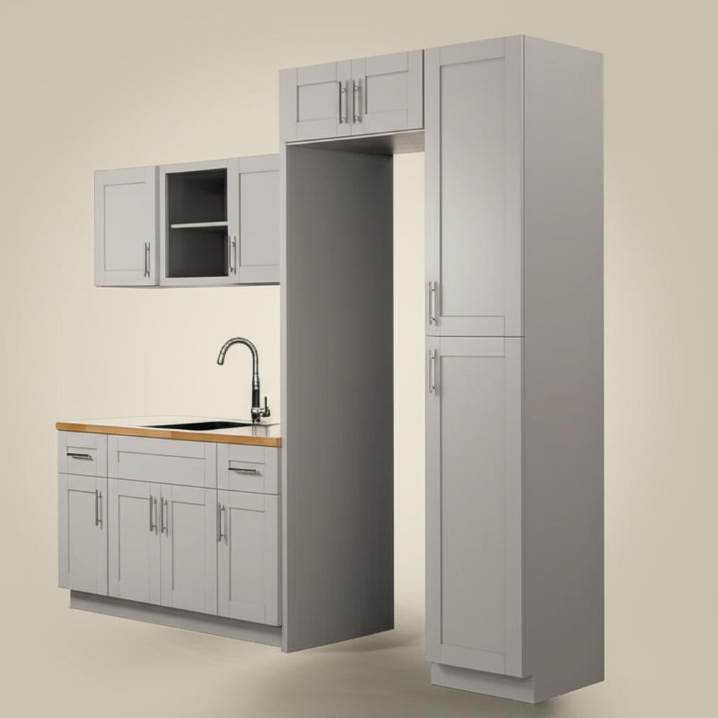 Transform your laundry room into a haven of style and functionality with the Richmond Vesuvius Gray Cabinet Set. The shaker-style design in a sophisticated gray finish complements modern interiors beautifully. Pair it with brushed nickel hardware for a polished look, and add decorative crown molding for a touch of luxury. This cabinet set is not just storage; it's a statement of refined living.