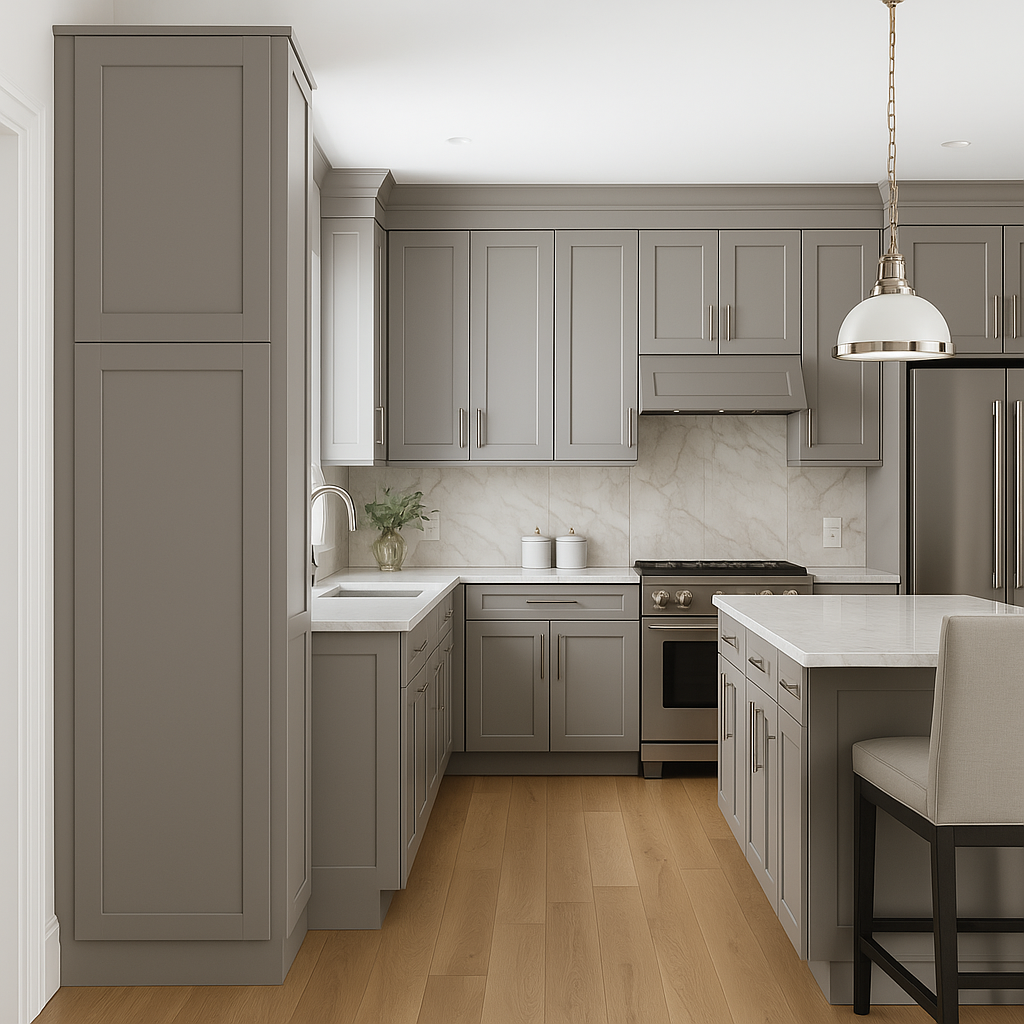 The Richmond Vesuvius Gray Pantry Cabinet by MILL'S PRIDE combines durable plywood construction with a sleek thermofoil finish, offering a stylish and functional addition to any kitchen. Featuring adjustable shelves and soft-close doors, this cabinet is designed for convenience and longevity.