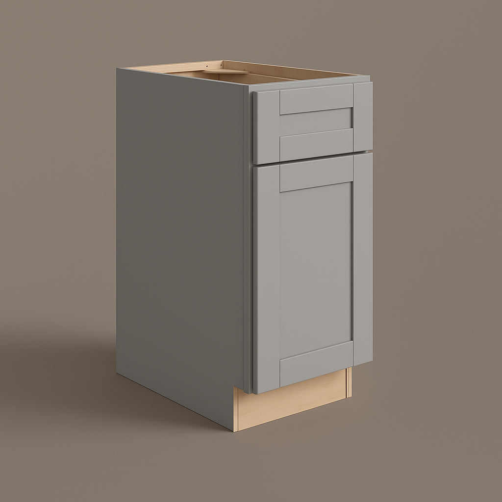 The MILL'S PRIDE Richmond Vesuvius Gray Shaker Base Cabinet combines durable plywood construction with a stylish thermofoil finish. Featuring soft-close doors and adjustable shelves, this cabinet is perfect for modern kitchens.