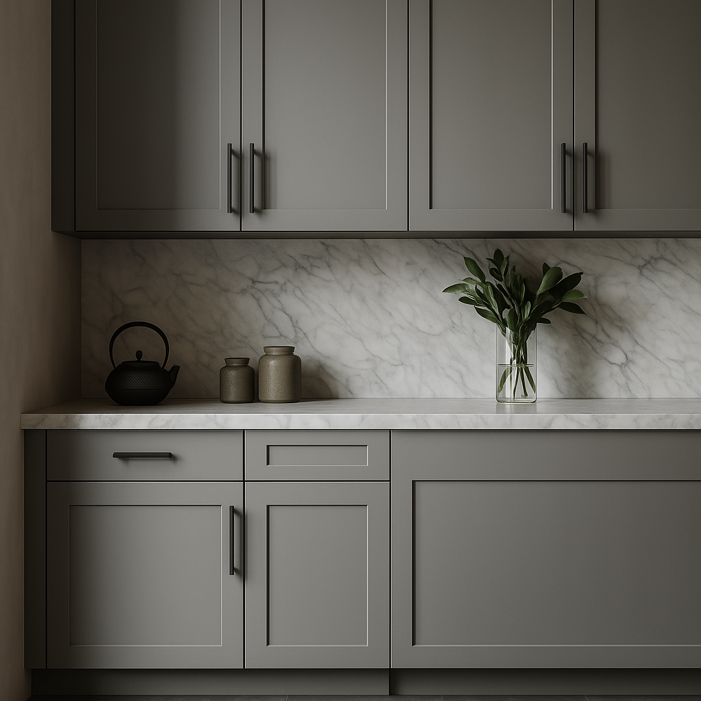 - Stylish Design: Features a Vesuvius Gray thermofoil finish and shaker-style doors.
