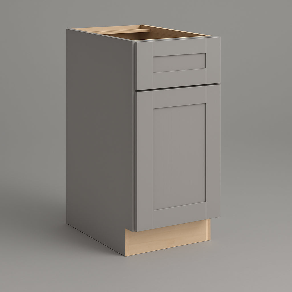The Richmond Vesuvius Gray Shaker Base Cabinet by MILL'S PRIDE combines durable plywood construction with a stylish thermofoil finish. Featuring soft-close doors and adjustable shelves, this cabinet is perfect for modern kitchens.