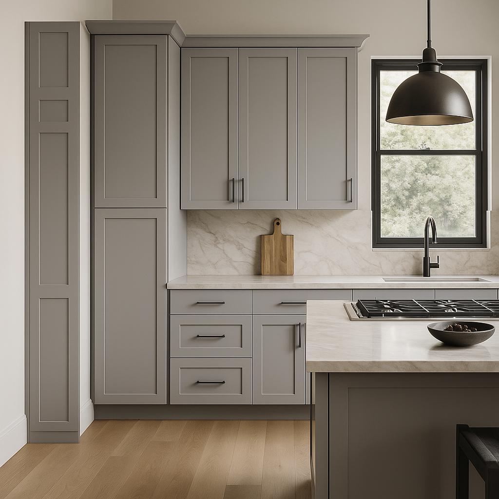 Upgrade your kitchen with the stylish and durable Richmond Vesuvius Gray Shaker Pantry Cabinet today!