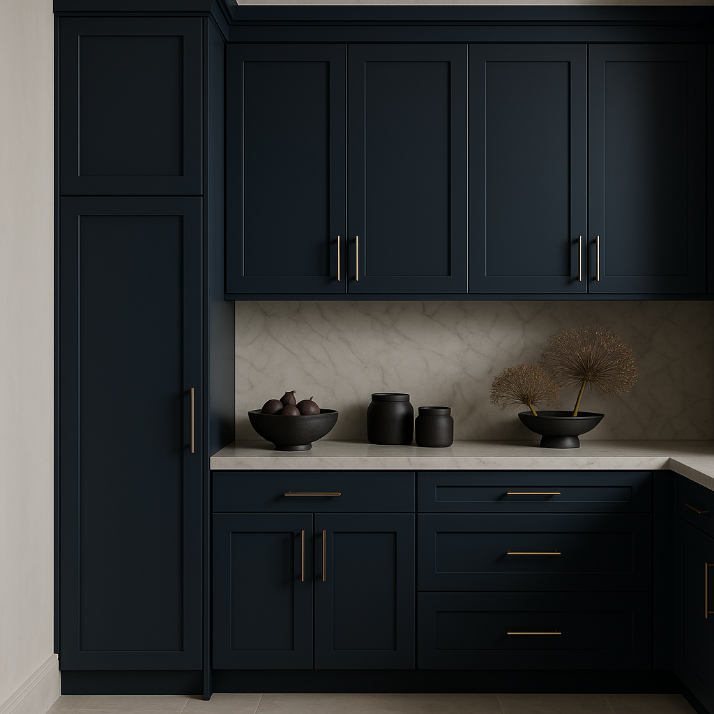 - Elegant Design: Deep blue thermofoil finish with shaker style doors.
