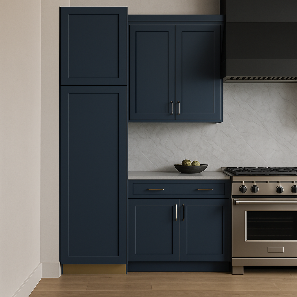 The MILL'S PRIDE Valencia Blue Shaker Pantry Cabinet combines elegant design with durable construction. Featuring a deep blue thermofoil finish and CARB II compliant plywood, this cabinet is perfect for upgrading your kitchen or completing a remodel.