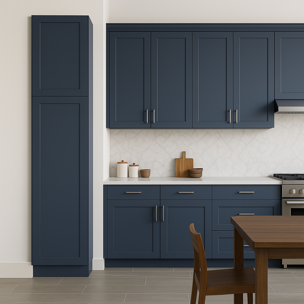Upgrade your kitchen with the stylish and durable Valencia Blue Shaker Pantry Cabinet today!