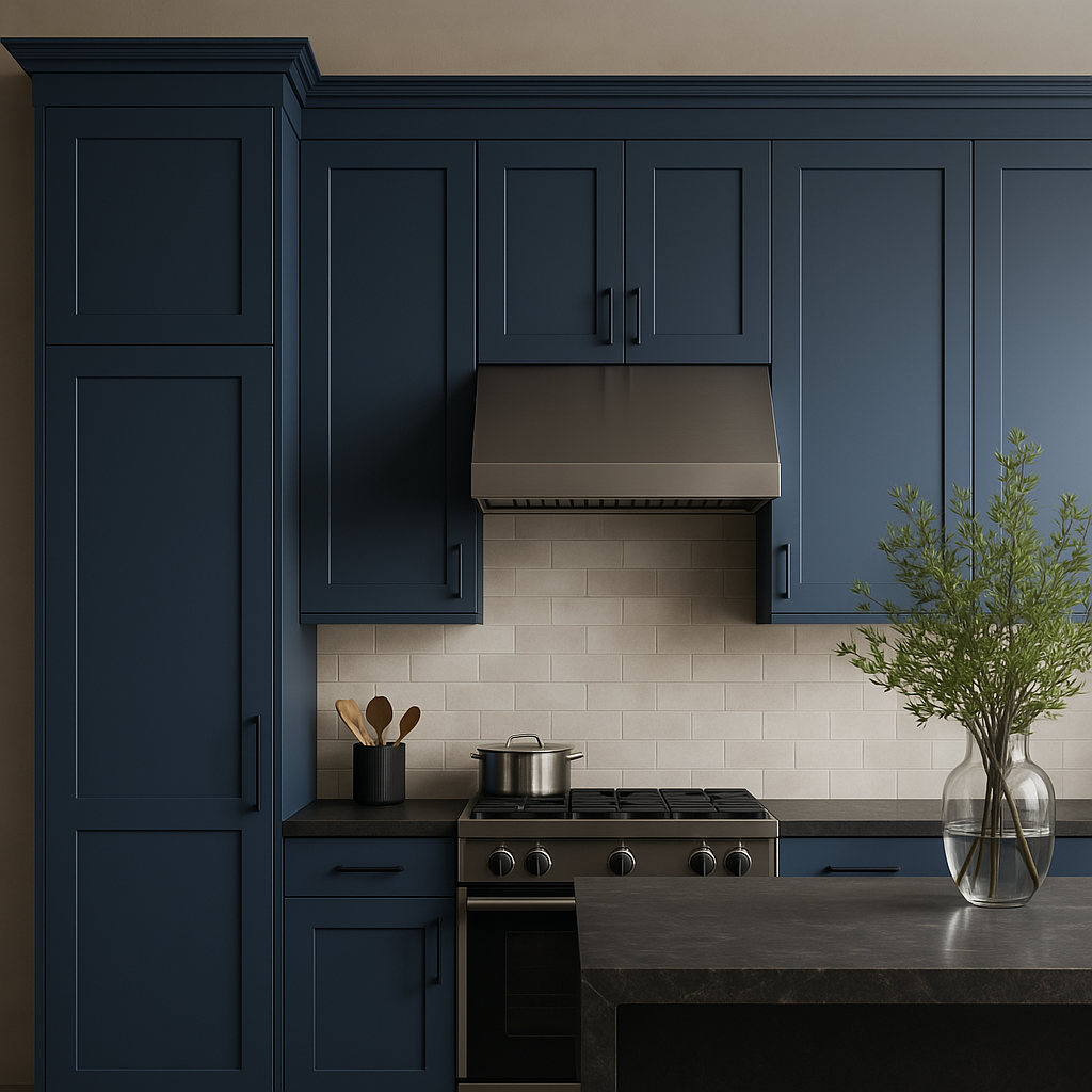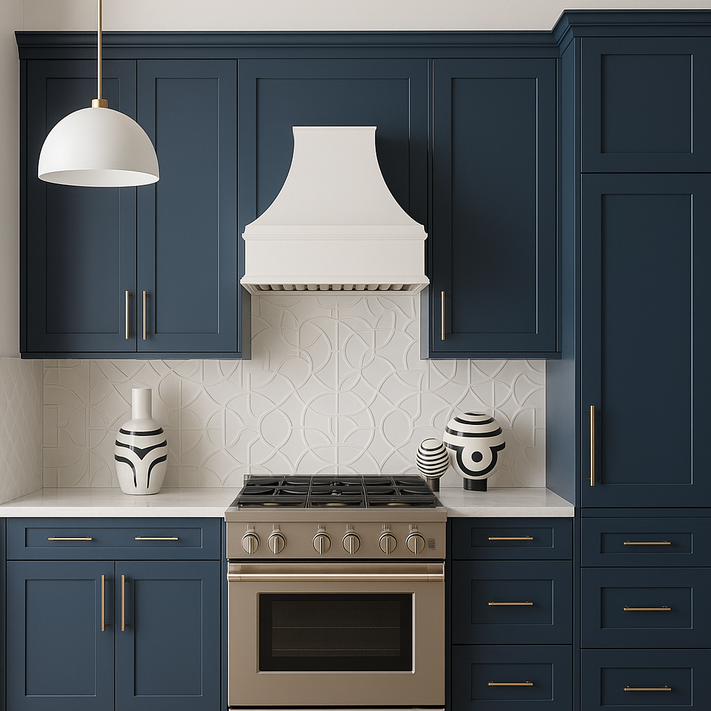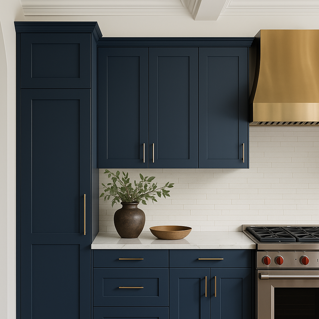 - Elegant Design: Deep blue thermofoil finish with contrasting white back panel.