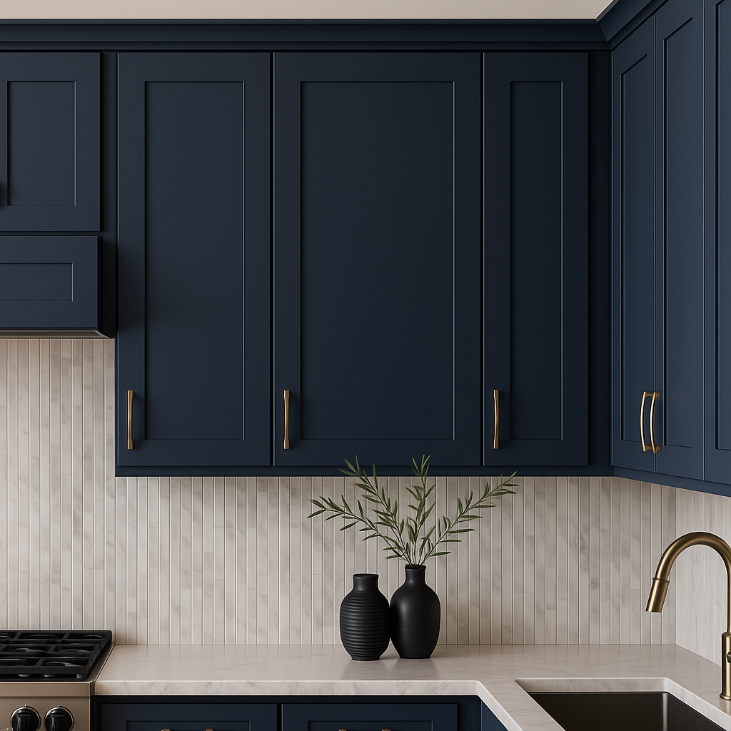 • Elegant Design: Features a deep blue thermofoil finish with shaker-style doors.