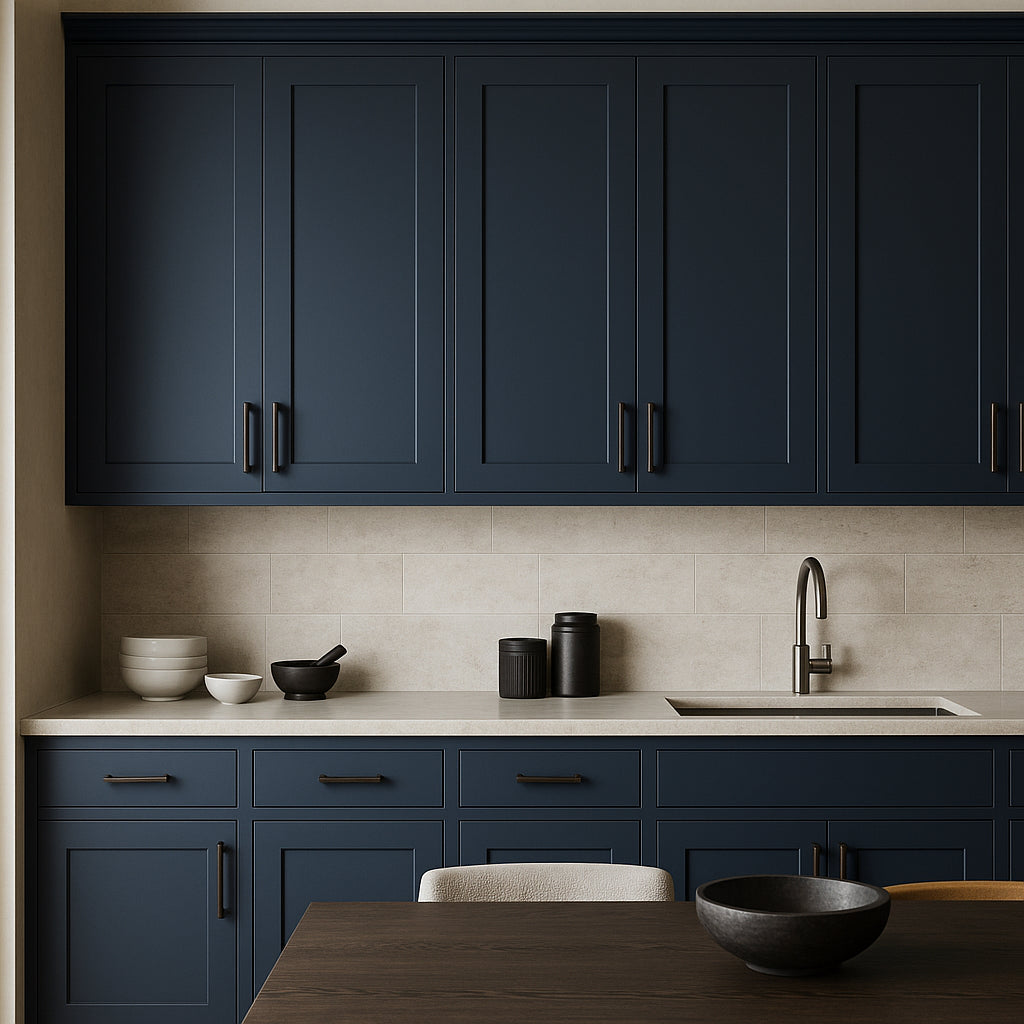 - Elegant Design: Deep blue thermofoil finish with contrasting white back panel.