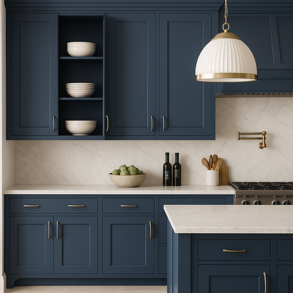 - Elegant Design: Deep blue thermofoil finish with contrasting white back panel.