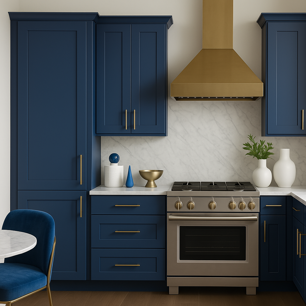 • Elegant Design: Valencia Blue thermofoil finish with shaker-style MDF doors.