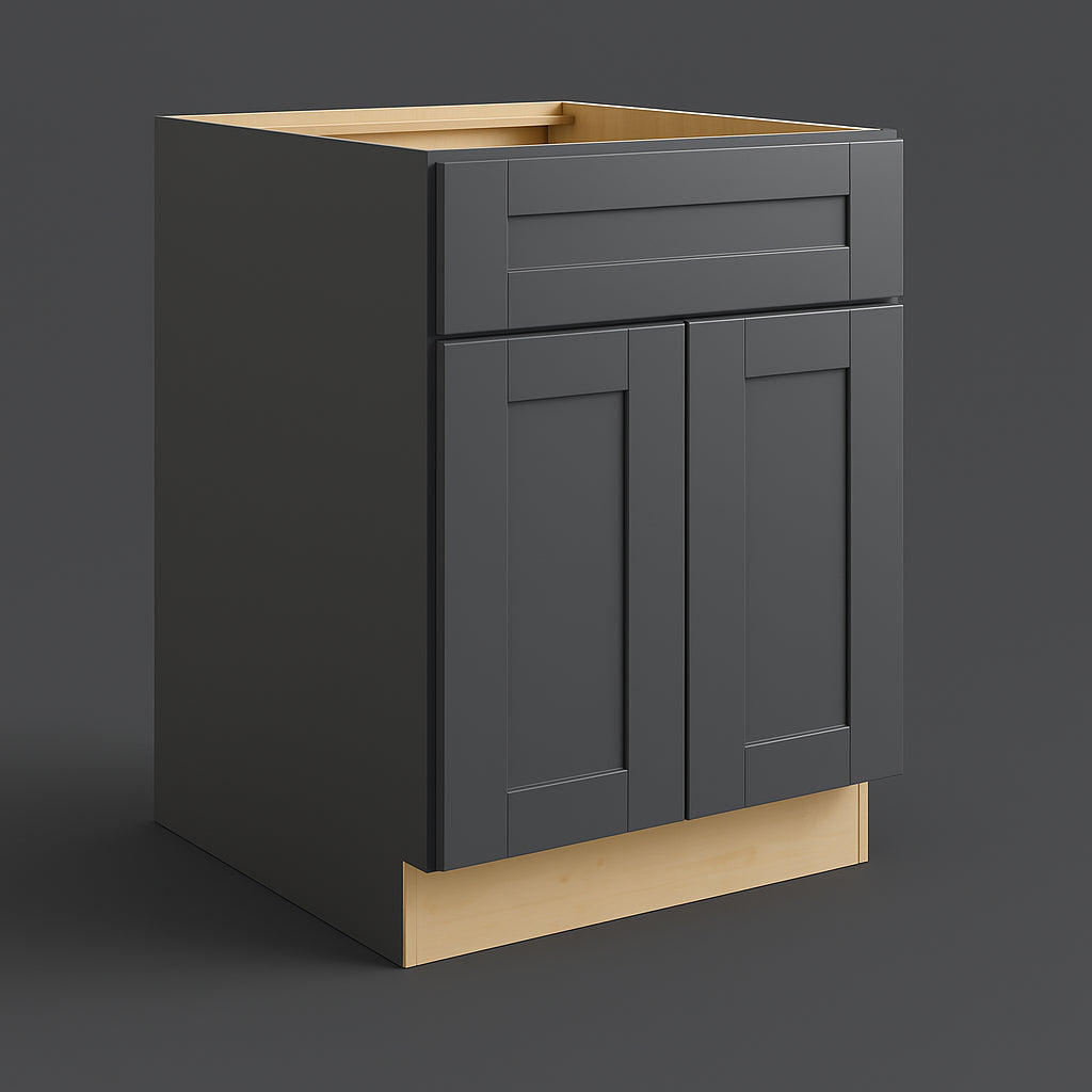 The Richmond Venetian Onyx Shaker Base Cabinet by MILL'S PRIDE combines style and functionality with its durable plywood construction and elegant thermofoil finish. Featuring soft-close doors and drawers, this cabinet is perfect for modern kitchens.