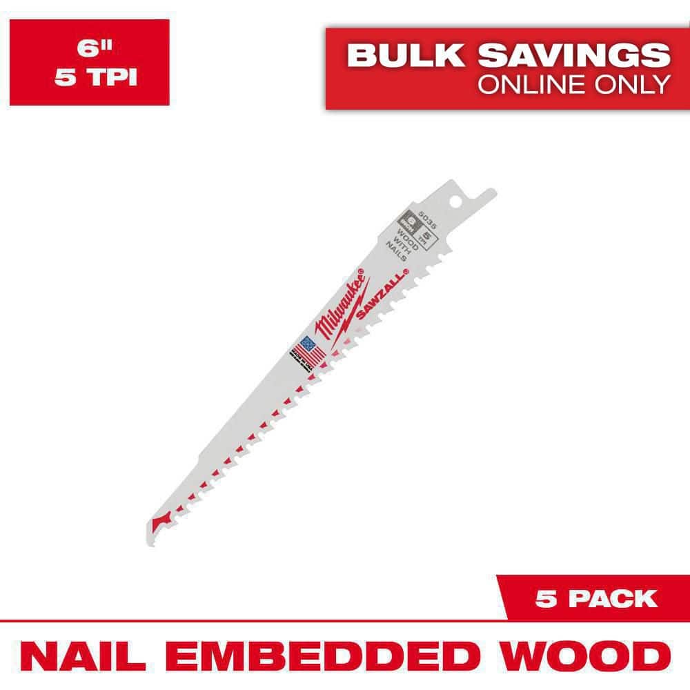 Milwaukee 6 in. 5 TPI Thin Kerf Wood Reciprocating Saw Blades, Bi-Metal, 5-Pack