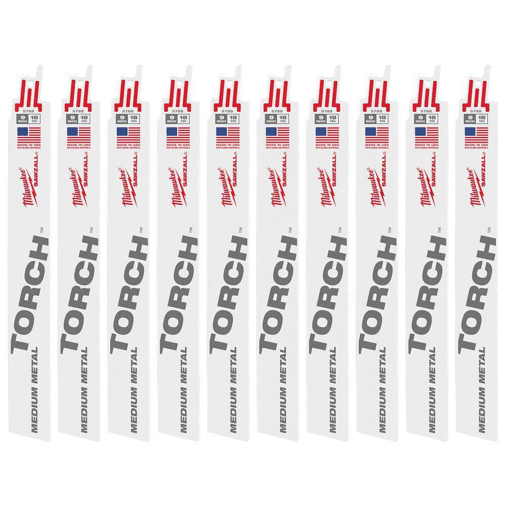 Milwaukee TORCH 9 in. 18 TPI Bi-Metal Metal Reciprocating Saw Blades, Medium Metal, 10-Pack (48-00-1788)