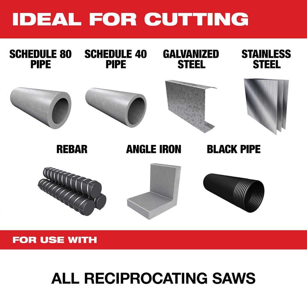 Designed for thick and extreme metal, Milwaukee42 TORCH with Carbide Teeth delivers long life and fast cutting. The 9 in., 7 TPI blade tackles cast iron, stainless steel, black pipe, and high‑strength alloys with durable carbide teeth.