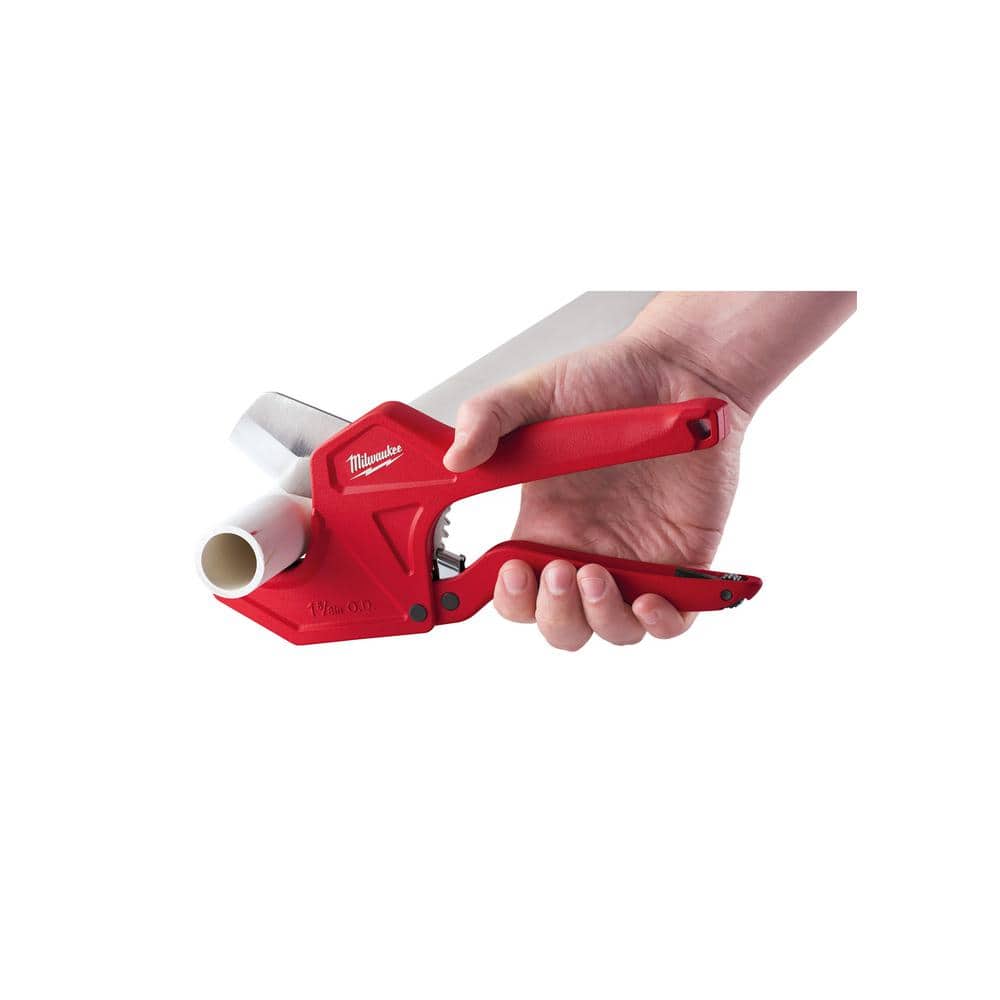 Milwaukee’s ratcheting pipe cutter delivers straight, easy cuts on plastic pipes with a stainless steel pierce-point blade. Ergonomic handles and a one-handed lock make it comfortable and convenient for all-day use. Built for durability, it features an all‑metal lock and optimized ratchet design.