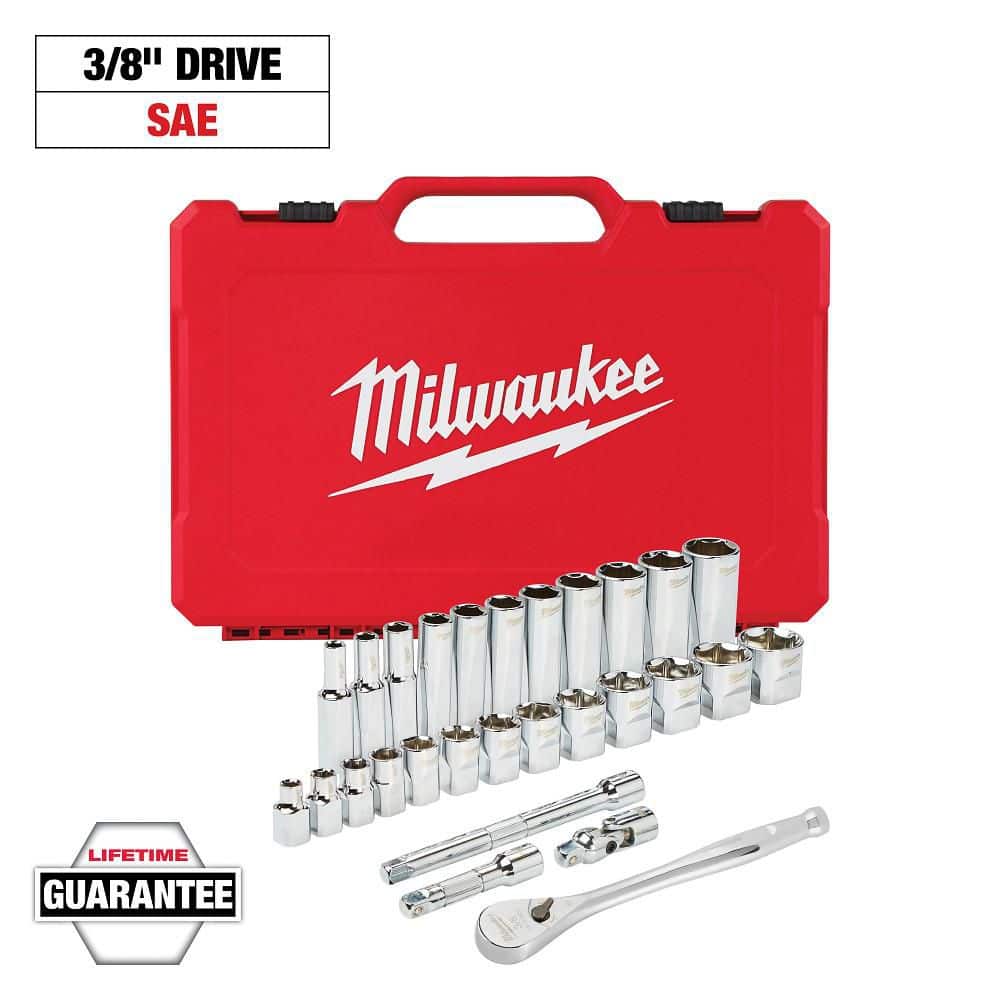 Regular price $99.97 Sale price $75.30 Save $24.67Milwaukee 28-Piece 3/8 in. SAE Ratchet & Socket Set
