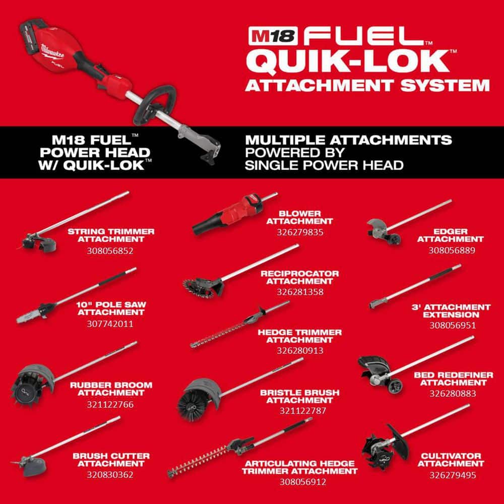 A: Yes, the QUIK‑LOK system works with multiple Milwaukee attachments like edger, hedge trimmer, pole saw, and more.