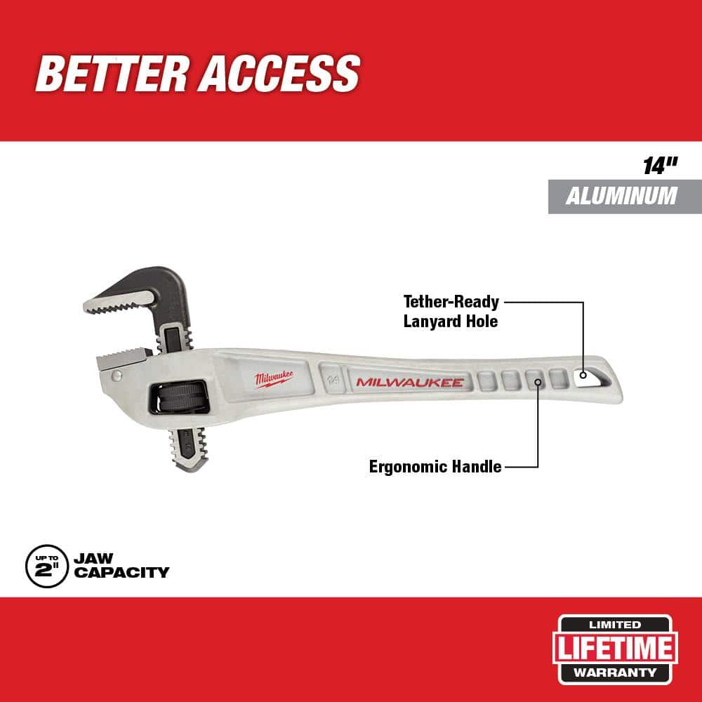 This Milwaukee aluminum offset pipe wrench delivers better access in tight or overhead spaces with a 14 in. length and 2 in. jaw capacity. Its lightweight aluminum body and ergonomic handle reduce fatigue while the parallel jaw opening and narrower hook head grip pipes securely. Built for professional use and backed by a limited lifetime warranty.