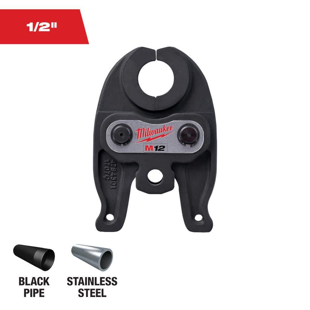 This 1/2 in. IPS press jaw pairs with the Milwaukee M12 FORCE LOGIC Press Tool to create fast, flameless connections on carbon and stainless steel pipe. Designed for tight-space access and one-handed operation, it delivers consistent, secure presses on Schedule 5–40 IPS fittings.