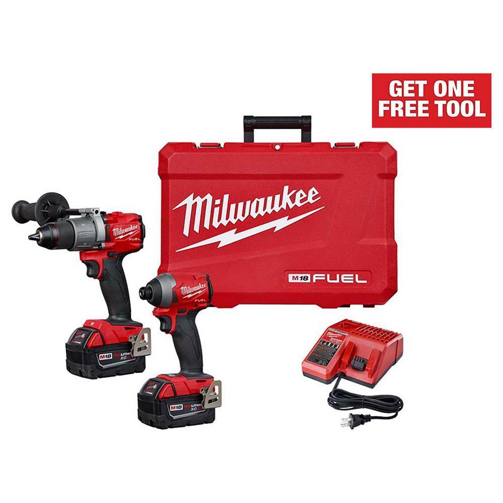 • Includes: (1) M18 FUEL 1/2 in. hammer drill (2804-20), (1) M18 FUEL 1/4 in. hex impact driver (2853-20), (2) M18 REDLITHIUM XC5.0 battery, (1) M18 and M12 multi-voltage charger, (1) side handle, (2) belt clip, (2) bit holder, (1) carrying case, (1) 2767-20 M18 FUEL 1/2 in. high torque impact wrench with friction ring